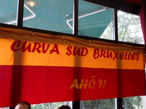 “Oh, regà, me raccomanno: domenica venite presto, che dovemo pija li posti”. Sciarpa giallo-rossa al collo, parlata romana: sembra di essere all’uscita dello stadio, e per certi versi è così. Siamo al Roma club di Bruxelles, punto di incontro e ritrovo per molti, italiani e non. Un posto ben conosciuto in città: è dal 2004 che esiste, e dal 2006 ha sede al De Valera’s, pub irlandese a Flegey, una delle zone più frequentate e movimentate della città. “Oggi è annata bene, mo’ vedemo de fa’ mejo domenica prossima”. Stefano, il presidente del club, non può che essere raggiante: oggi la Roma ha vinto. Nella piccola stanzetta è rimasto solo lui, intento a smontare gli striscioni, come sempre avviene. Quello grande, “storico”, l’ha realizzato lui stesso: un lungo drappo giallo e rosso cucito a mano, e con su scritto “Curva sud Bruxelles – Ahò?!”. Espressioni tipiche di Roma e della Roma: la classica esclamazione romana (aho?!) unita alla nota parte di stadio Olimpico cuore del tifo romanista racchiudono un angolo di Italia trapiantata a Bruxelles, per alcuni da una vita. Stefano è in Belgio dal 1998, il terzo scudetto l’ha visto e vissuto qui. “Ma la partita decisiva l’ho vista a Roma…”, tiene a sottolineare con orgoglio.