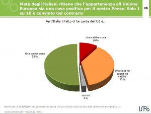 Il dato si deve alla difficoltà economica: di questo gli autori dello studio non hanno dubbi. Del resto, nonostante la disaffezione sempre più forte e sempre più diffusa, il 73% degli italiani dichiara di sentirsi un cittadino europeo (“molto” cittadini per il 41% degli intervistati, “abbastanza” per il 32% di loro), anche se pure in questo ambito le convinzioni europeistiche mostrano un arretramento: a sentirsi cittadini europei era il 77% degli intervistati solo fino a marzo 2011. Questo 73% di italiani che si dichiara cittadino europeo è composto esclusivamente da under 40: l’84% degli studenti ricade in questa categoria. L’Europa, dunque, “è giovane”. Un dato mostrato dall’87% di intervistati di età compresa tra i 18 e i 24 anni a dichiararsi cittadini europei, e dall’analoga risposta fornita dal 78% delle persone tra i 25 e i 35 anni. Nella voce dedicata al sentimento di appartenenza, “Gli italiani e l’Unione europea. Un rapporto che cambia?”, mette in mostra un dato interessante: a rispondere più “per nulla” alla domanda “vi sentite cittadini d’Europa?” soprattutto gli elettori del Movimento 5 stelle (37%, contro il 33% dell’Idv e il 30% del Pdl). Un segnale davvero poco incoraggiante, in chiave europea, per un partito che in Italia è in forte crescita di consensi.