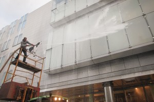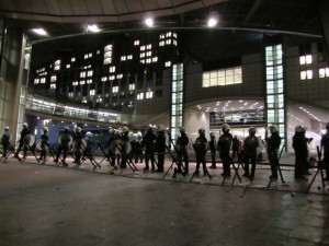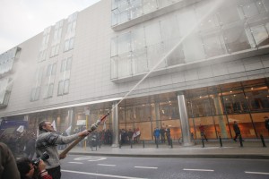 Il liquido spruzzato sull’edificio, ieri in serata tensioni con la polizia con lanci di petardi