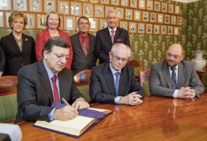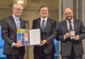 La cerimonia di consegna del Premio a Oslo con i tre Presidenti delle istituzioni Ue