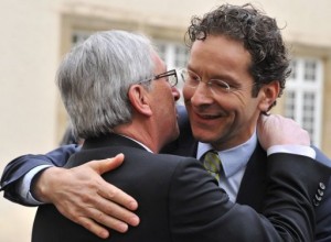 Un successore di Jean-Claude Juncker ancora non c’è, ma la nomina del nuovo presidente dell’Eurogruppo fa già discutere. Il gruppo dei Verdi al Parlamento europeo lamenta “un’altra occasione persa” per affidare ad una donna un ruolo di primo piano, dopo il caso di Yves Mersch, nominato membro del consiglio dei Governatori della Banca centrale europea nonostante le forti richieste del Parlamento europeo di affidare ad una donna quello stesso incarico. Alla successione di Juncker è stato candidato (e si è anzi fatto avanti) l’attuale ministro delle Finanze olandese, Jeroen Dijsselbloem (nella foto con Juncker di spalle)). Una candidatura unica, che quasti certamente – a meno di colpi di scena – dovrebbe essere sostenuta nel corso della riunione dell’Eurogruppo di oggi. Sven Giegold, portavoce dei Verdi e membro della commissione Problemi economici del Parlamento Ue, non ci sta. L’accordo a nominare Dijsselbloem successore di Juncker, critica, “rappresenta ancora un volta un’occasione persa per rispondere all’assenza di donne ai più alti livelli decisionali dell’Eurozona”.