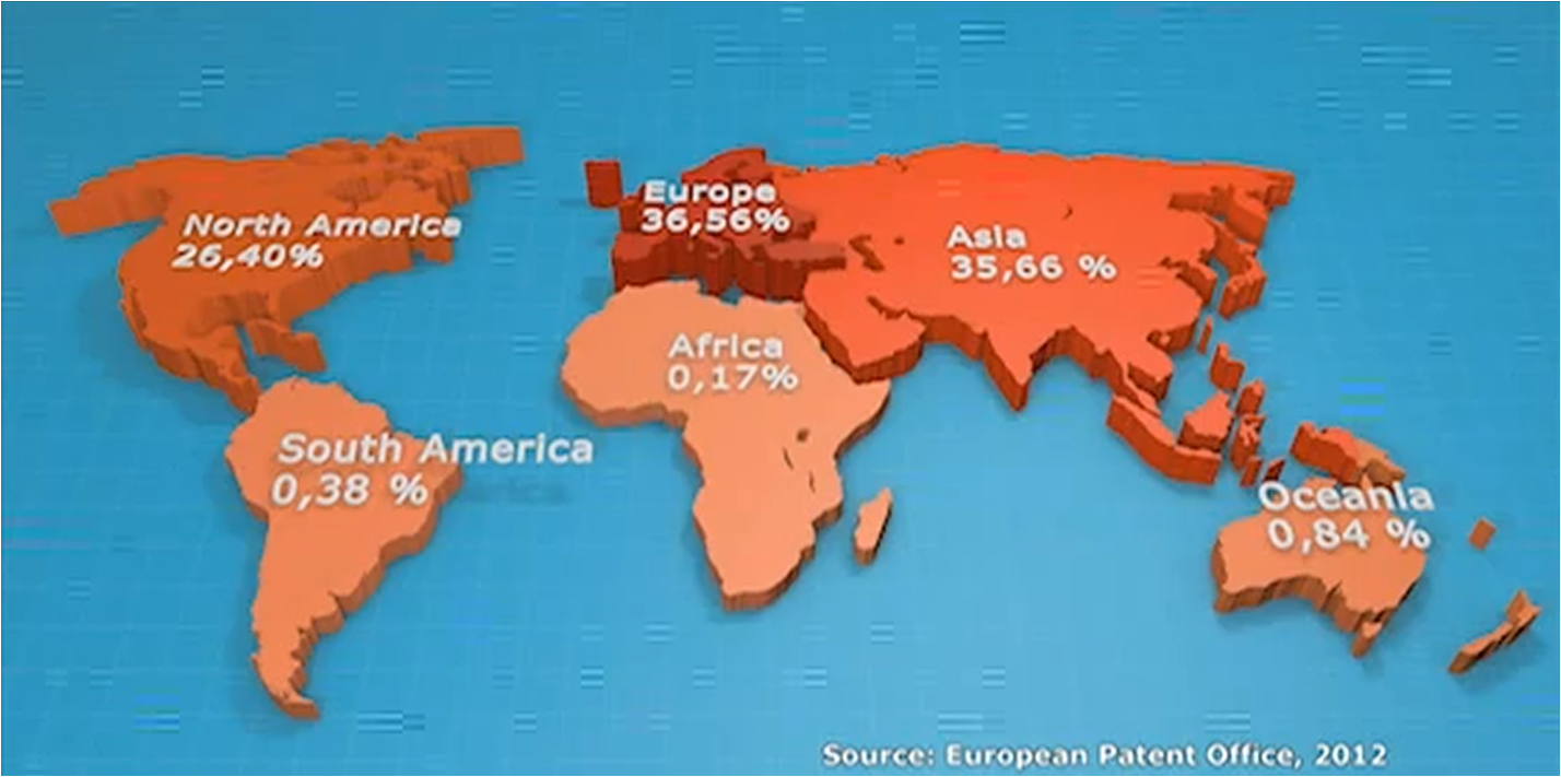 2) Are these numbers true? Let’s listen carefully once more. The video starts with the quote I mention above. Then, at 4 minutes 16 seconds into the film, you see a graphic of the world. And the voiceover says: ‘Shortly more than 36% of all patent filing in 2012 comes from Europe with Asia following closely behind’.