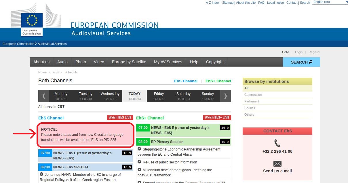 In Europa il croato arriva prima della Croazia. Il Paese in questione diventerà il ventottesimo Stato dell’Unione europea a partire dall’1 luglio, e allora l’Ue si prepara: con l’ingresso di un nuovo Stato si arricchisce anche l’elenco delle lingue ufficiali, ed Ebs – il canale visivo satellitare della Commissione europea – inizia già a “ragionare” in croato. Sono disponibili infatti già da oggi le traduzioni nella nuova lingua, come dimostra l’annuncio pubblicato dalla stessa emittente e che potete vedere nella foto in allegato.