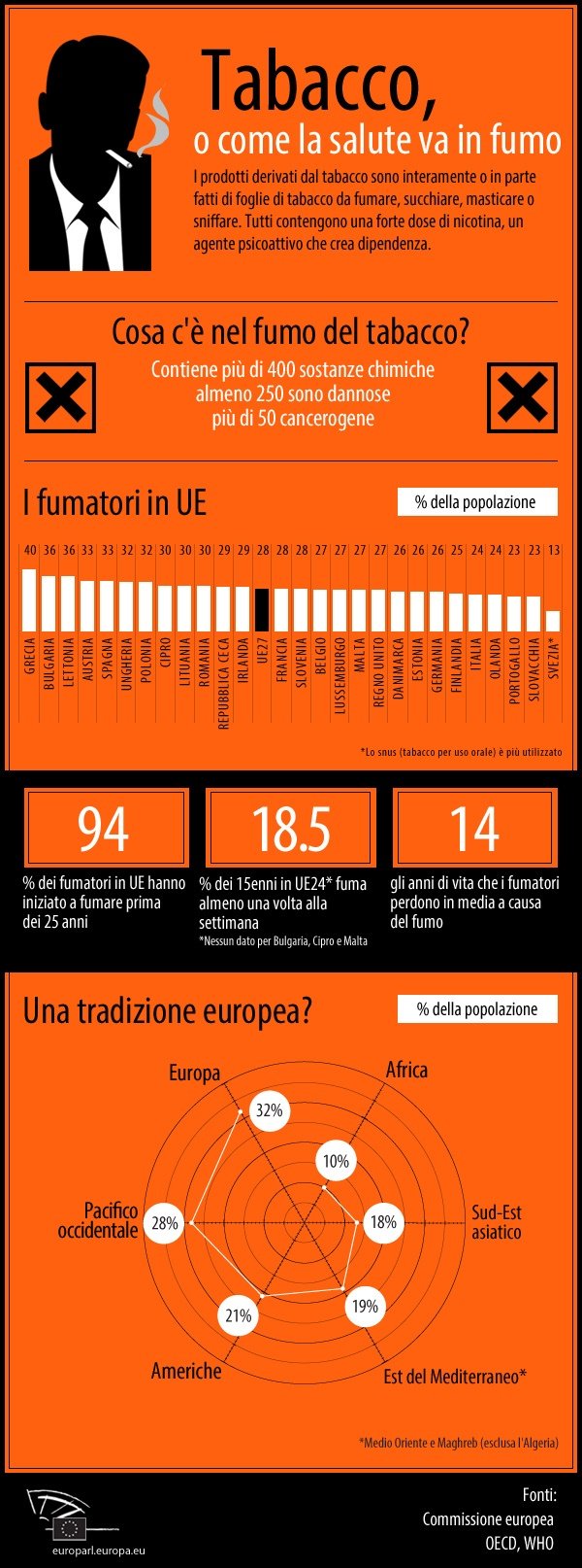 Ecco una tabella messa a punto dal Parlamento europeo sul consumo di tabacco. Domani l’Aula voterà la proposta di direttiva elaborata dalla Commissione europea