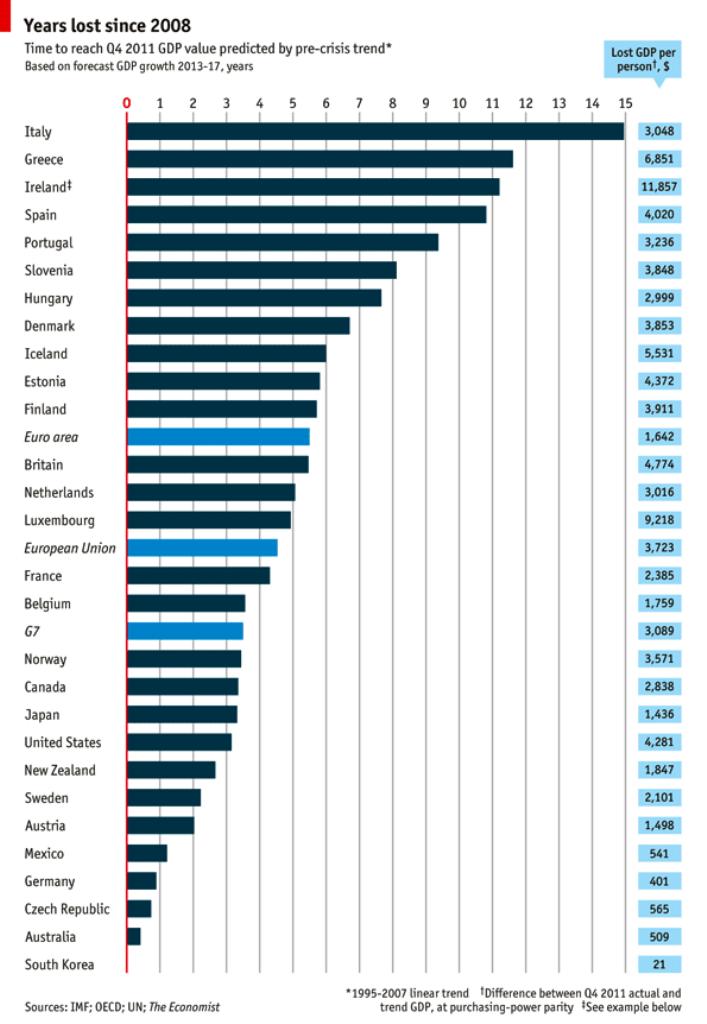 La Germania e gli Stati Uniti sono tornati ai livelli di reddito pre-crisi già dal 2011. La Francia e l’Inghilterra ci torneranno presto. Noi, con le politiche attuali, se tutto va bene, tra 10 anni minimo. Nessuno può avere dubbi che siamo in una situazione di emergenza. Lo hanno ripetuto negli ultimi giorni sia il Governatore della Banca d’Italia Ignazio Visco che ci ricorda come la disoccupazione sia tornata ai livelli degli anni Cinquanta, con un crollo mai visto nel dopoguerra della caduta dell’occupazione giovanile. Secondo Visco, i giovani che hanno tra i 15 e 24 anni e che lavorano sono scesi dal 61% del 2007 al 43% oggi e quelli tra i 24 e i 34 dal 74% al 66%. Il Presidente della Confindustria ripete giorno dopo giorno che è terrorizzato dalla crisi e aspetta proposte concrete quando incontrerà il premier Enrico Letta il 19 di febbraio. Chi volesse approfondire può andare qui.