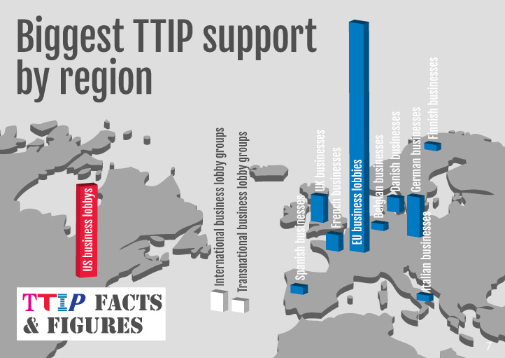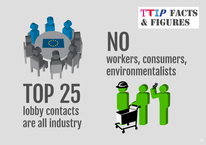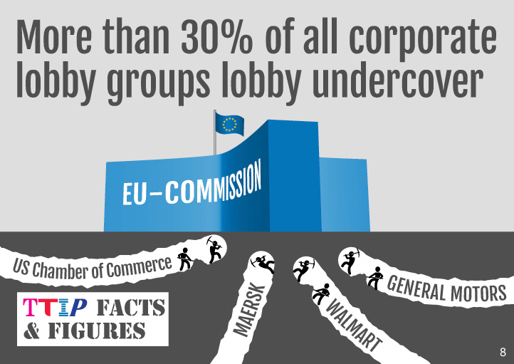 Le infografiche rivelano un giro di incontri veramente ampio e assolutamente sbilanciato verso il settore privato. Secondo i dati Ceo dei 560 incontri avvenuti 520, ovvero il 92%, sono stati con i lobbisti aziendali e solo 26 (il 4%) con gruppi di interesse pubblico come sindacati o associazioni di consumatori. Nel complesso, i dati suggeriscono che le più attive sono state le aziende con sede negli Stati Uniti, Germania e Regno Unito e naturalmente i gruppi di pressione organizzati a livello comunitario, come la BusinessEurope (la Confindustria europea) e la European Services Forum, una lobby che cura gli interessi di istituti come la Deutsche Bank e la City del Regno Unito. Totalmente assenti associazioni o imprese di Grecia e gran parte dell’Europa orientale. Il dato rivela anche che oltre il 30 per cento (94 su 269) dei gruppi di interesse del settore privato che hanno incontrato la DG Commercio sul TTIP non sono iscritti al Registro per la trasparenza dell’Ue, tra questi aziende come Wal-Mart, Walt Disney, General Motors , France Telecom e Maersk.