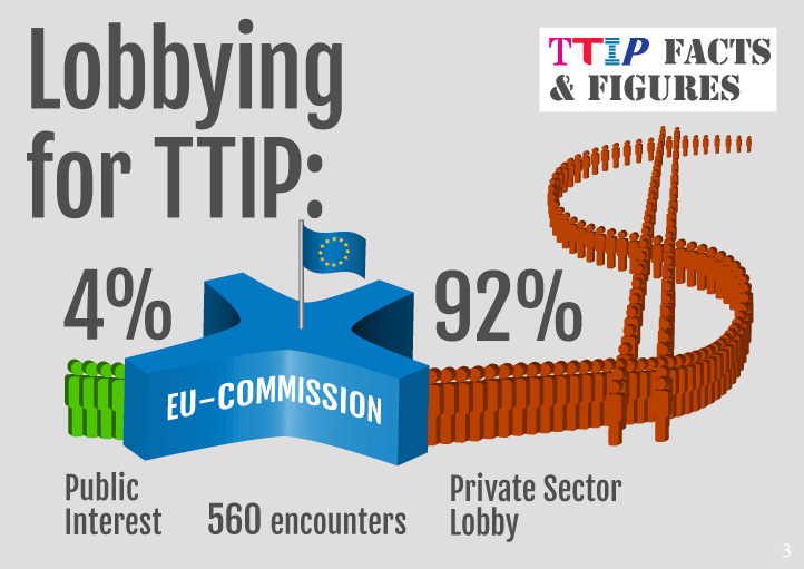 Il principale gruppo di pressione sulla Commissione europea è stato fino a questo momento quello del settore agroalimentare di cui fanno parte multinazionali come Nestlé e Mondelez (la ex Kraft) ma anche la Food and Drink Europe, il più grande gruppo lobbista europeo che rappresenta aziende del calibro di Coca Cola e Unilever. Multinazionali alimentari, agro-commercianti e produttori di sementi hanno avuto più contatti con la Direzione Generale Commercio che i lobbisti della farmaceutica, chimica, industria finanziaria e di auto messi insieme. È quanto risulta da una ricerca effettuata dal Corporate Europe Observatory (CEO), un gruppo di ricerca che lavora per la trasparenza nel rapporto tra lobby e istituzioni comunitarie, che ha pubblicato una serie di infografiche sul lavoro delle lobby a Bruxelles rispetto ai negoziati del Ttip.