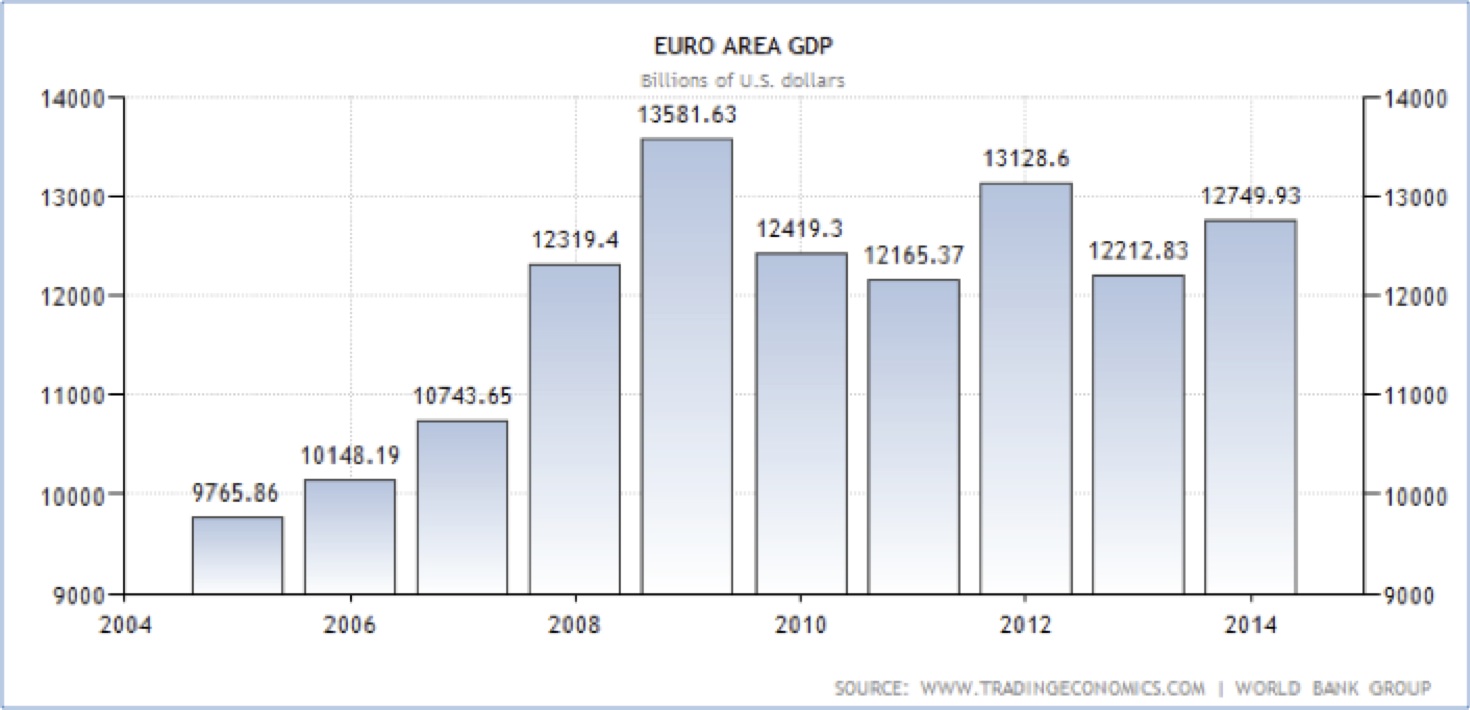 Questo nello stesso periodo in cui il Pil dell’eurozona si è contratto quasi del 3% (vedi il grafico qui sotto), in cui l’area euro ha continuato a registrare tassi di disoccupazione ai massimi storici e in cui migliaia di piccole e medie imprese sono state costrette a chiudere i battenti, soprattutto nei paesi della periferia.