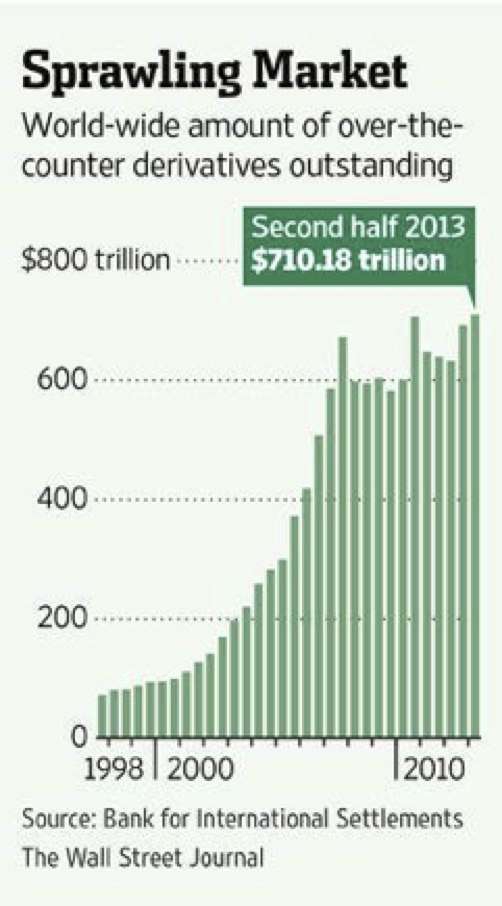 Anche in questo caso, come negli Stati Uniti, vediamo uno scollamento piuttosto evidente tra indici di borsa – e sistema finanziario in particolare – ed economia reale, sintomo di una nuova bolla in corso. Ancor più sorprendente è la situazione che si registra nel mercato dei derivati, che come è noto sono stati una delle cause principali del crash del 2008. Secondo gli ultimi dati ufficiali (anche se in realtà è impossibile stimare l’entità esatta dei derivati in circolazione), questi ammonterebbe all’incirca a 710 trilioni di dollari – all’incirca 50 trilioni di dollari in più rispetto al picco pre-crisi e quasi dieci volte il valore del Pil mondiale.
