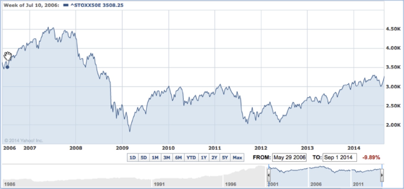 Questo per quanto riguarda gli Stati Uniti. Il caso dell’eurozona, pero, è forse ancora più interessante: se guardiamo all’indice STOXX 50, che comprende le cinquanta maggiori imprese finanziarie e non operanti nell’eurozona (ovviamente sono incluse tutte le principali banche del continente), vediamo che i valori di borsa – seppur lontani dai valore pre-crisi – sono stabilmente in aumento dalla metà del 2012 (registrando una crescita quasi del 50% in due anni).