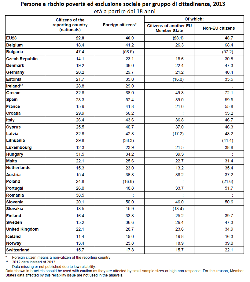 In questa classifica l’Italia si colloca a metà strada, con un rischio povertà ed esclusione sociale delle persone non europee del 46.7%, al di sotto della media Ue, che arriva al 48.7%. Inoltre, nella penisola le persone locali sono meno esposte a vivere in condizioni di precarietà rispetto agli stranieri, sia europei che non. Mentre per gli italiani il rischio è del 26.4%, per gli stranieri di un altro stato membro Ue si parla del 36.8%. In linea con le tendenze registrate da Eurostat, anche in Italia gli stranieri extracomunitari sono i più esposti all’indigenza, registrando un rischio del 43.6%. Percentuale molto alta se paragonata a quella slovacca (15.9%), islandese (19.0%) e olandese (23.0%).