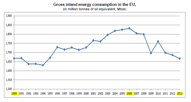 L’Europa consuma meno energia rispetto agli anni passati ma quella prodotta non è comunque sufficiente a soddisfare l’attuale fabbisogno interno. Secondo l’ultimo studio condotto da Eruostat, l’ufficio statistico dell’Unione Europea, nel 2013 i cittadini europei hanno utilizzato circa il 9% in meno di energia rispetto al 2006, riportando l’Ue a livelli di consumo simili a quelli degli anni ’90. In particolare, dai 1832,2 milioni di tonnellate di petrolio equivalente (Mtep) impiegati nel 2006, anno di picco del consumo energetico europeo, si è passati ai 1666,2 Mtep del 2013, un valore più vicino a quello del 1990, quando gli Stati membri Ue consumavano 1667,3 Mtep. A fronte di questo calo complessivo del consumo energetico europeo, l’Ue continua a non produrre una quantità di energia sufficiente rispetto alle proprie esigenze energetiche interne, e soddisfa solo il 47% della domanda. In altre parole, il 53% dell’energia viene importata da Paesi extracomunitari.