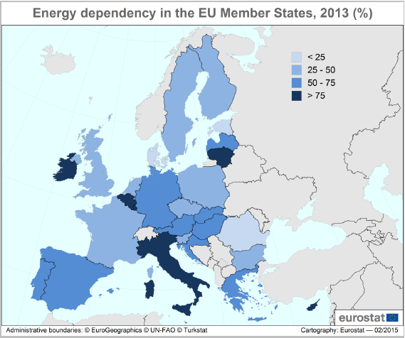 Il grado di dipendenza energetica da fonti esterne varia notevolmente da uno Stato membro all’altro. Tra i Paesi che dipendono maggiormente dalle importazioni energetiche troviamo i piccoli Stati di Malta (104,1%), Lussemburgo (96,9%) e Cipro (96,4%), ma anche l’Italia si colloca nella parte alta della classifica, con una dipendenza dalle importazioni del 76,9%, simile a quella riscontrata in Lituania (78,3%) e Belgio (77,5%), ben al di sopra della media europea (53,2%). Dal lato opposto della classifica stillata da Eurostat, Estonia (11,9%), Danimarca (12,3%) e Romania (18,6%) figurano come i Paesi meno dipendenti energeticamente d’Europa. In questo quadro