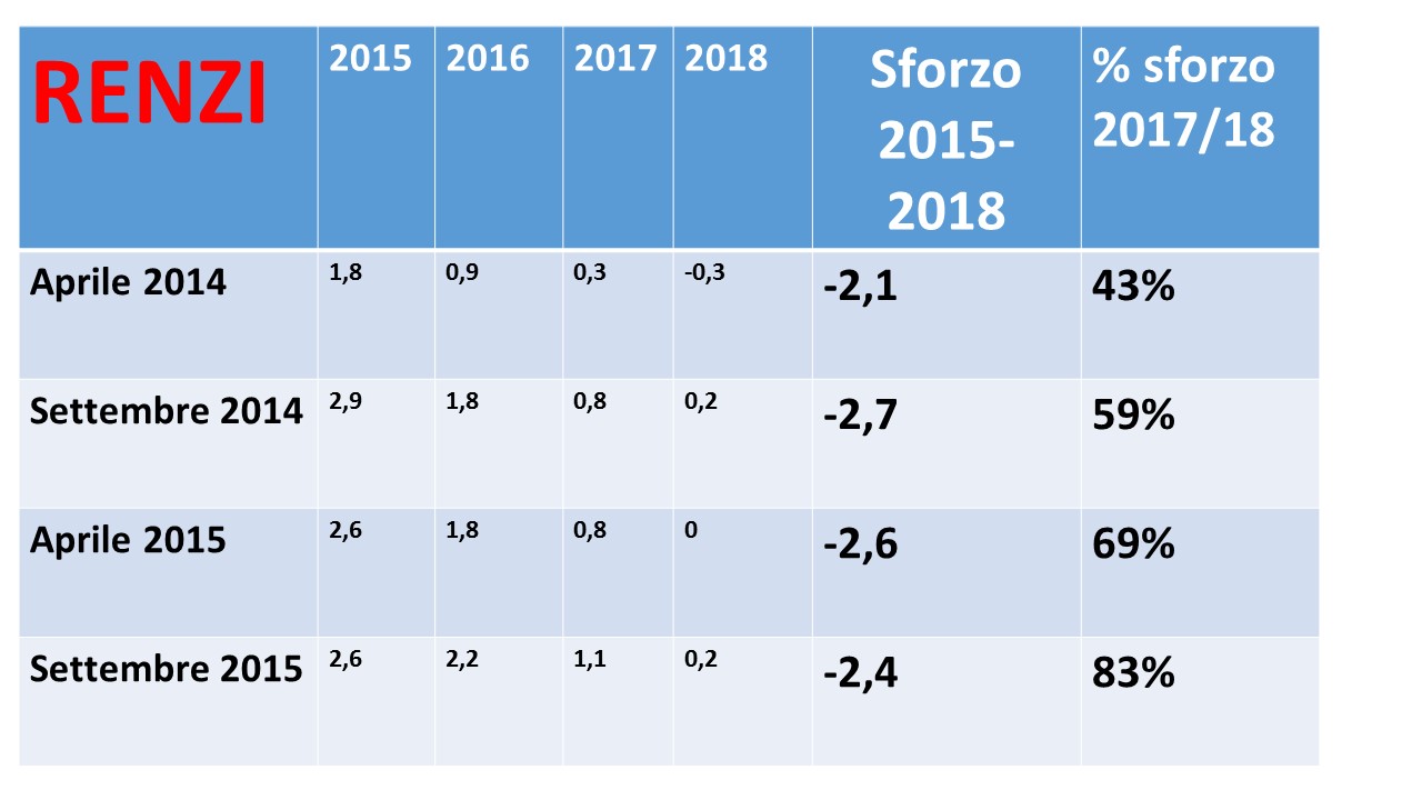 Da quando il governo Renzi si è insediato sono quattro i documenti di Economia e Finanza che ha presentato (due DEF, aggiornati ambedue durante l’anno a settembre): quattro progetti per come gestire le finanze pubbliche nel quadriennio 2015-2018. Progetti che ci aiutano a rispondere ad una domanda chiave: come è cambiato al riguardo Renzi in questi due anni?