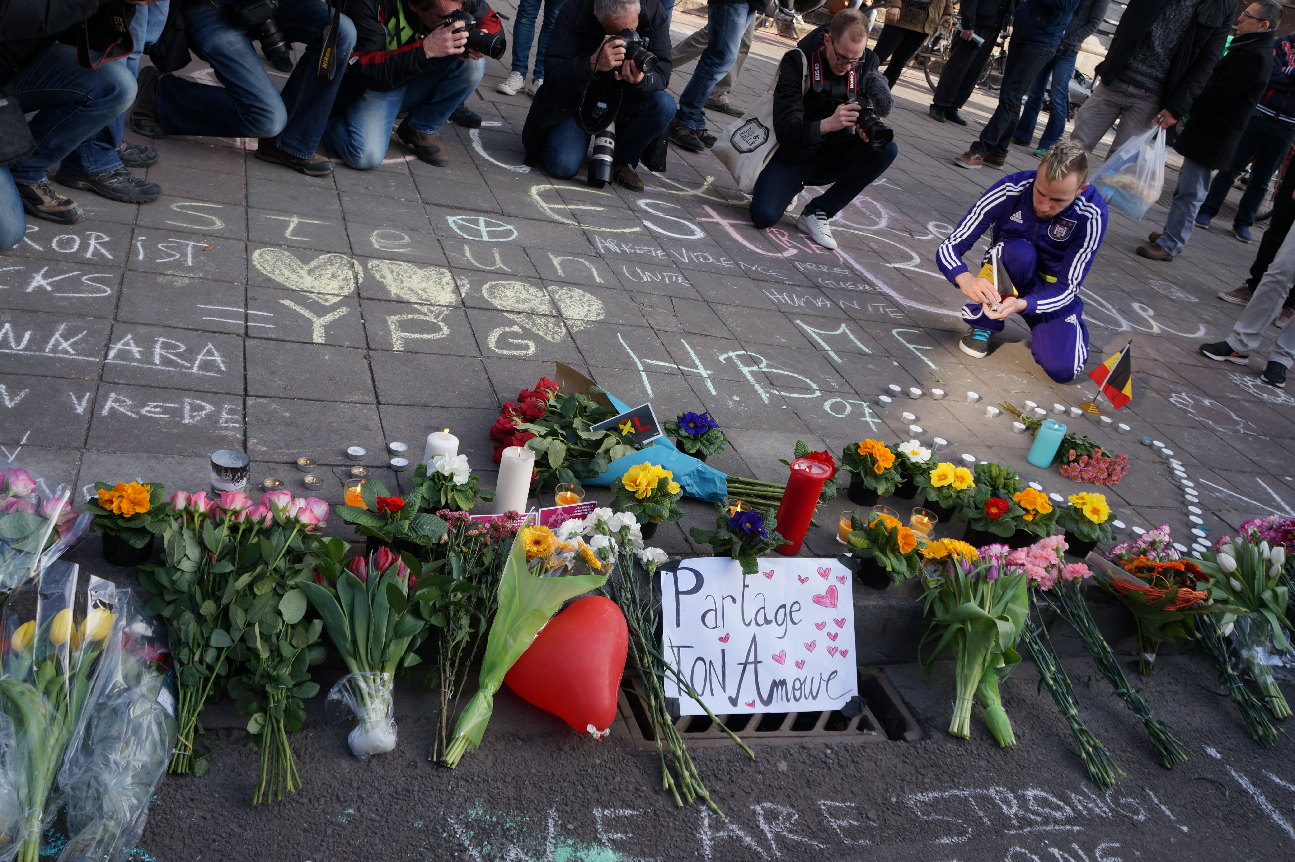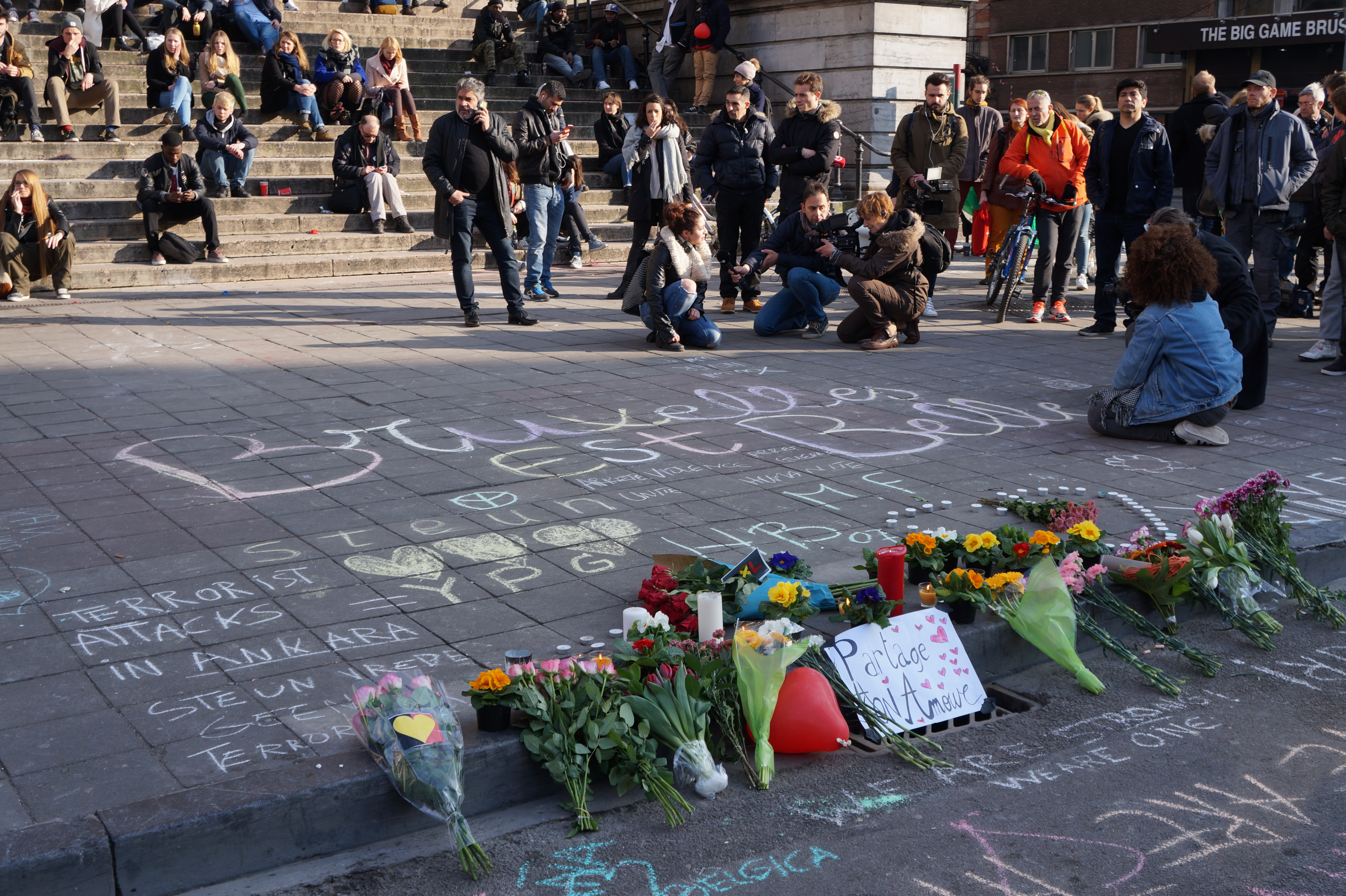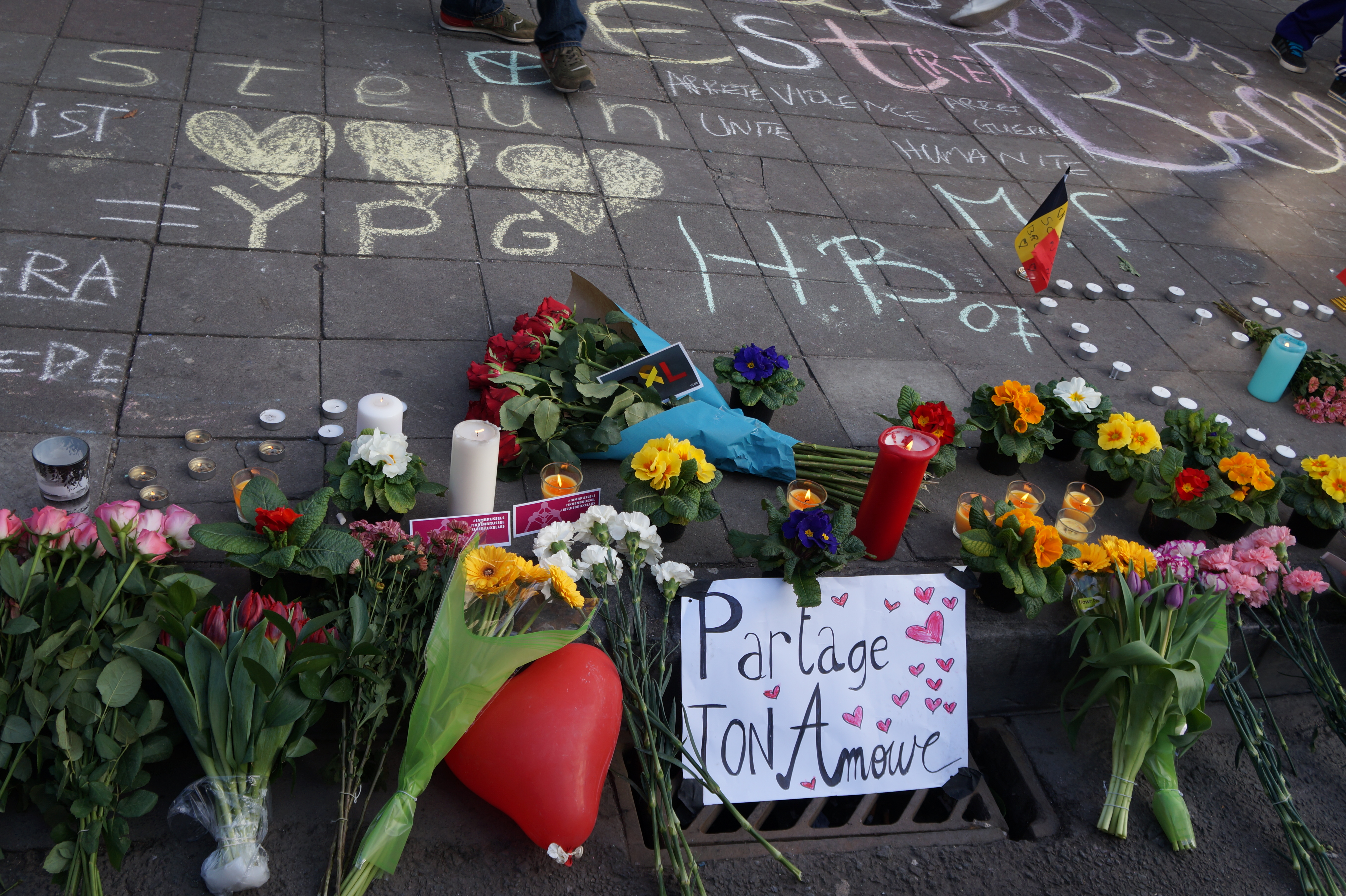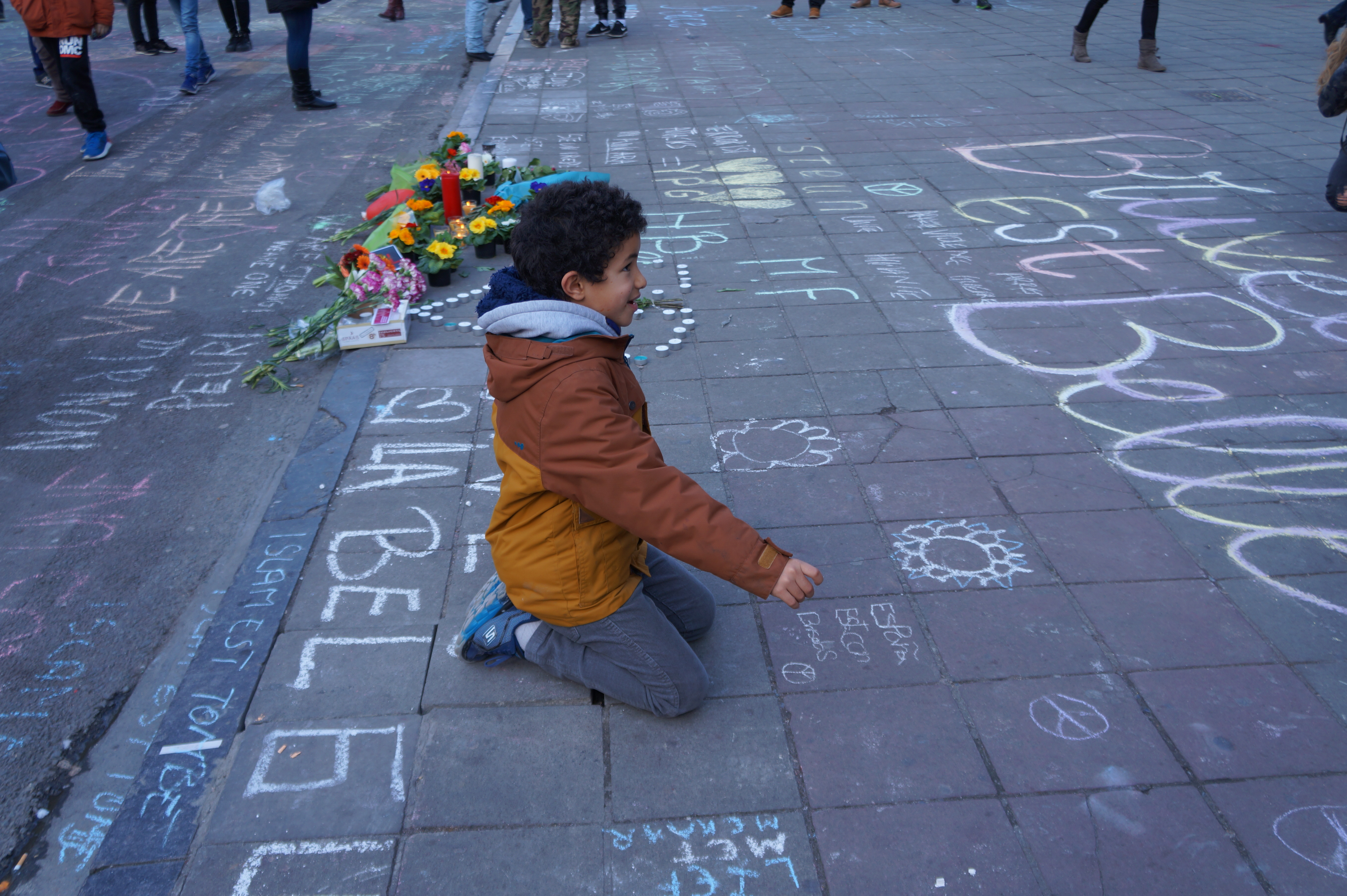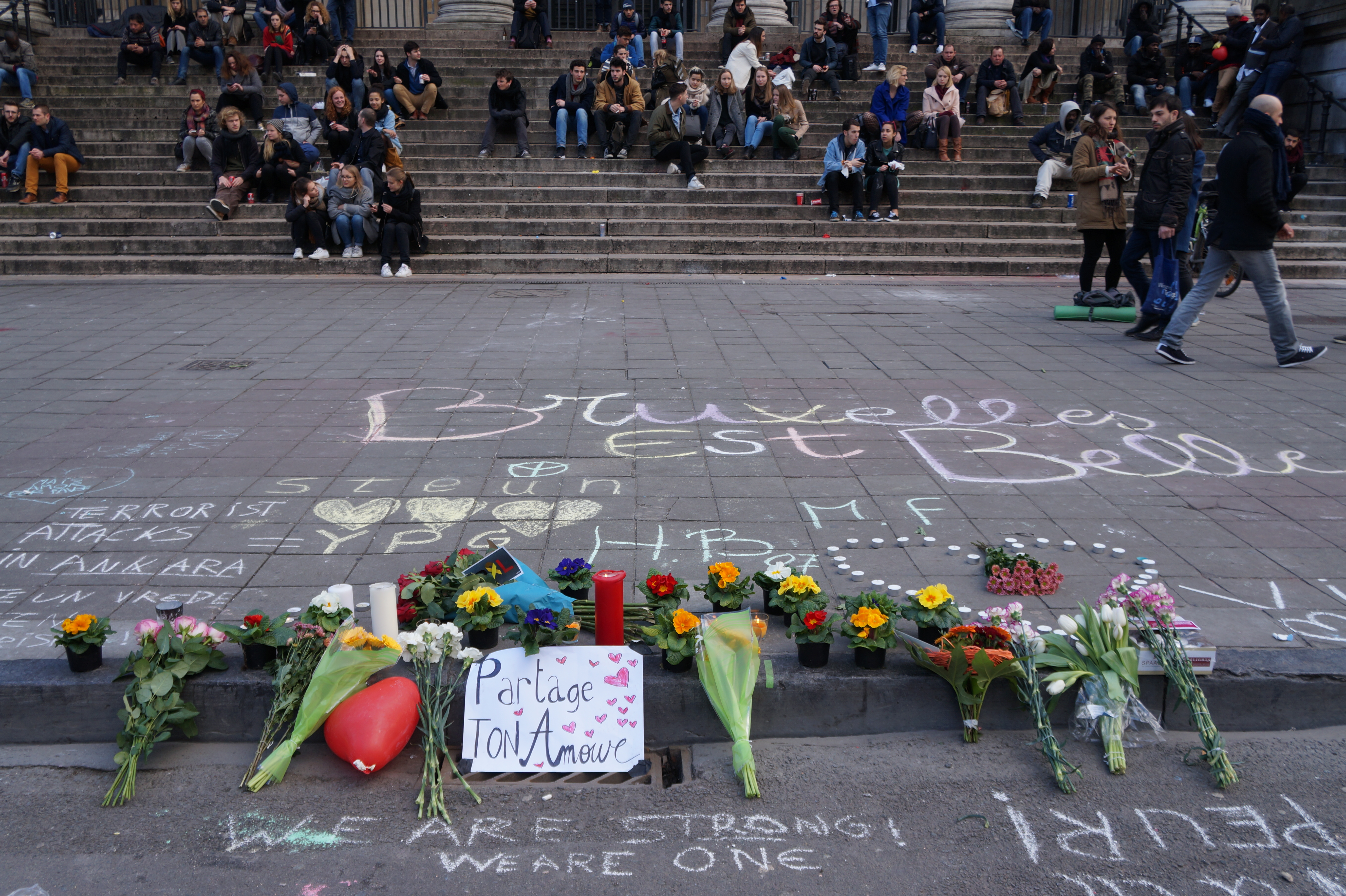 Bruxelles – I cittadini di Bruxelles si sono riuniti in piazza della Bourse, in pieno centro, per manifestare contro il terrorismo e la paura. Una manifestazione spontanea con fiori e messaggi lasciati dai passanti sul marciapiede. “Bruxelles è bella”, “Siamo forti, siamo uno” e “Condividi il tuo amore”, hanno scritto i cittadini con gessetti colorati.