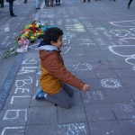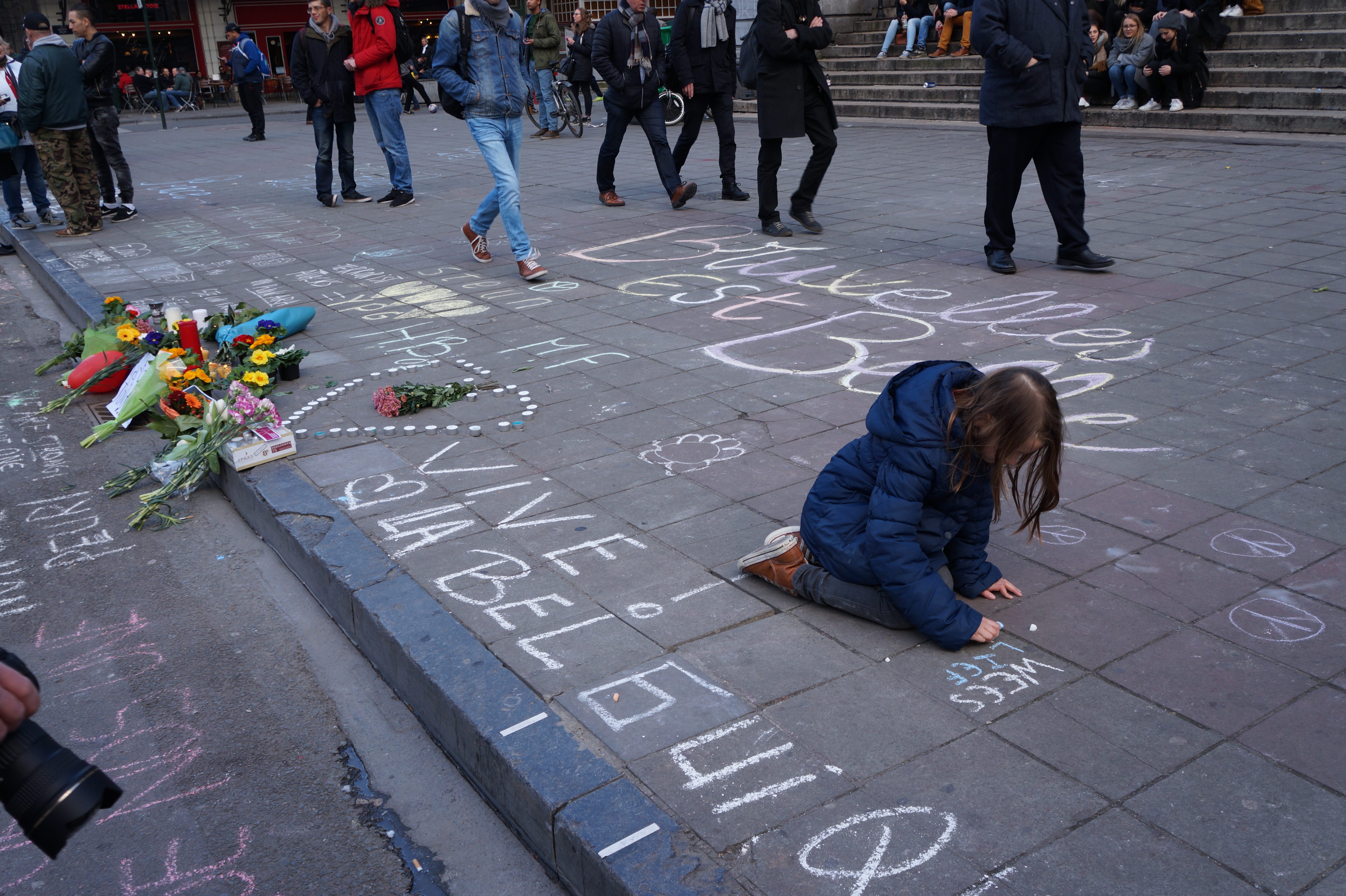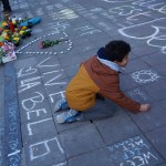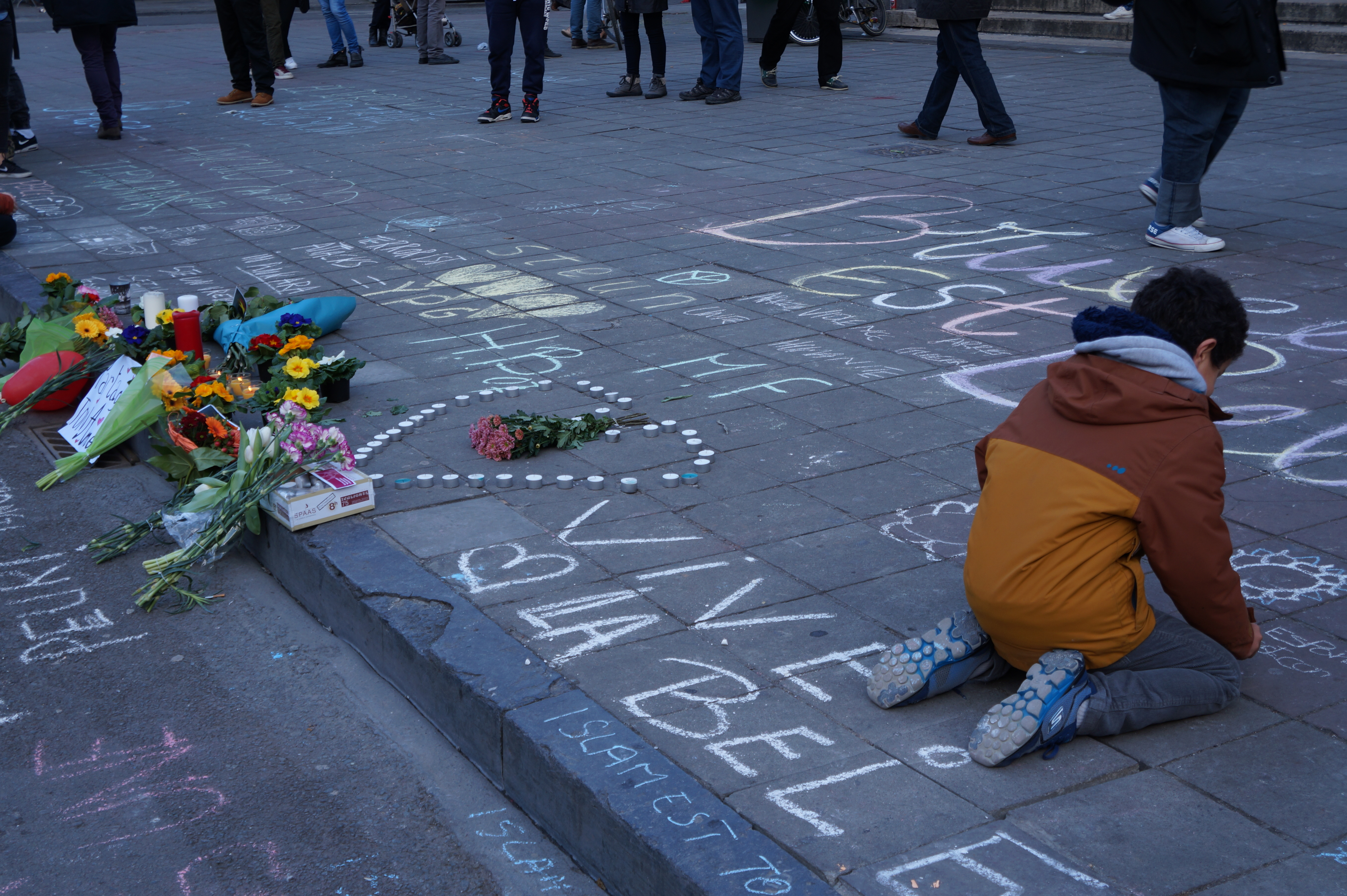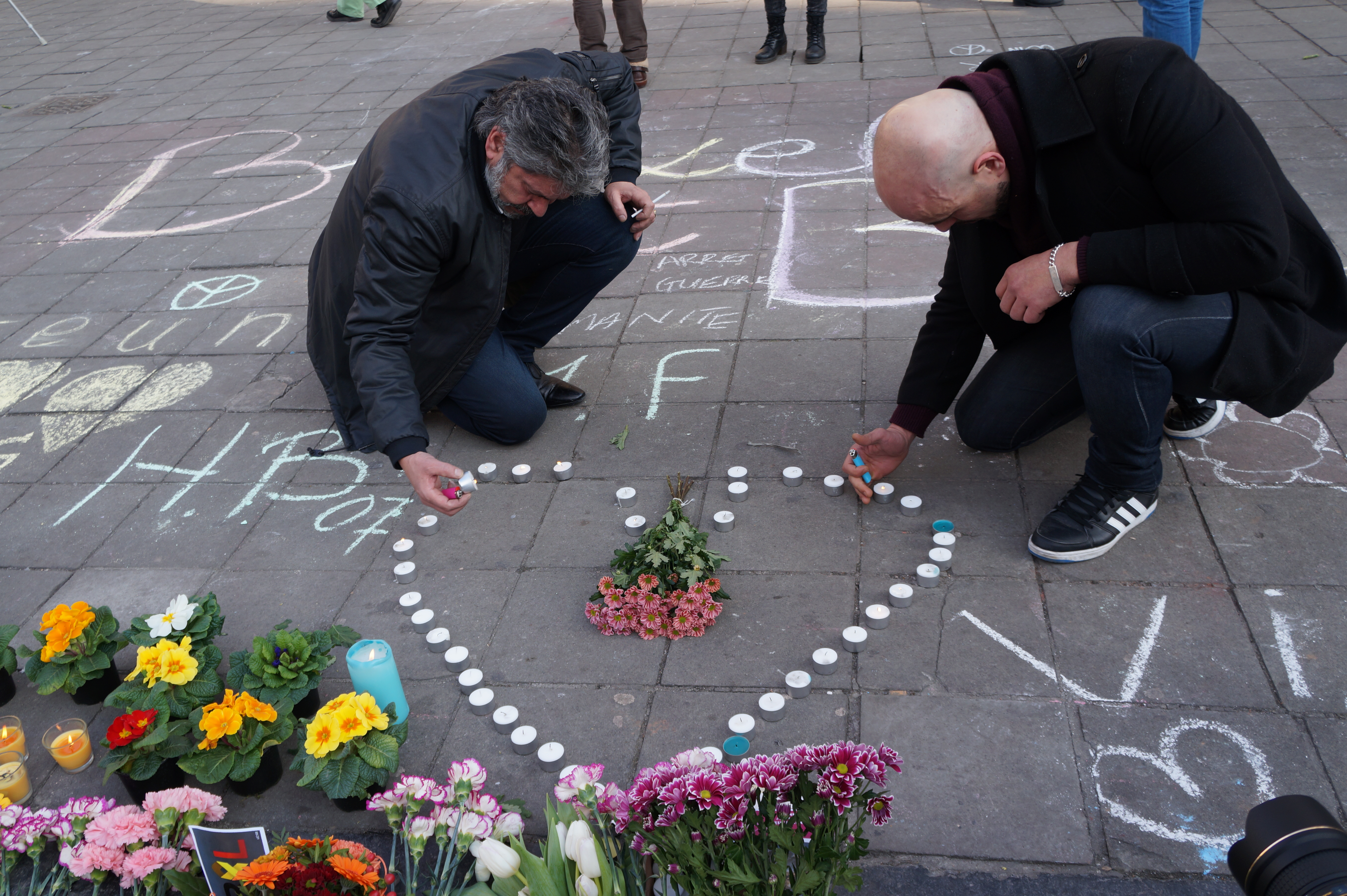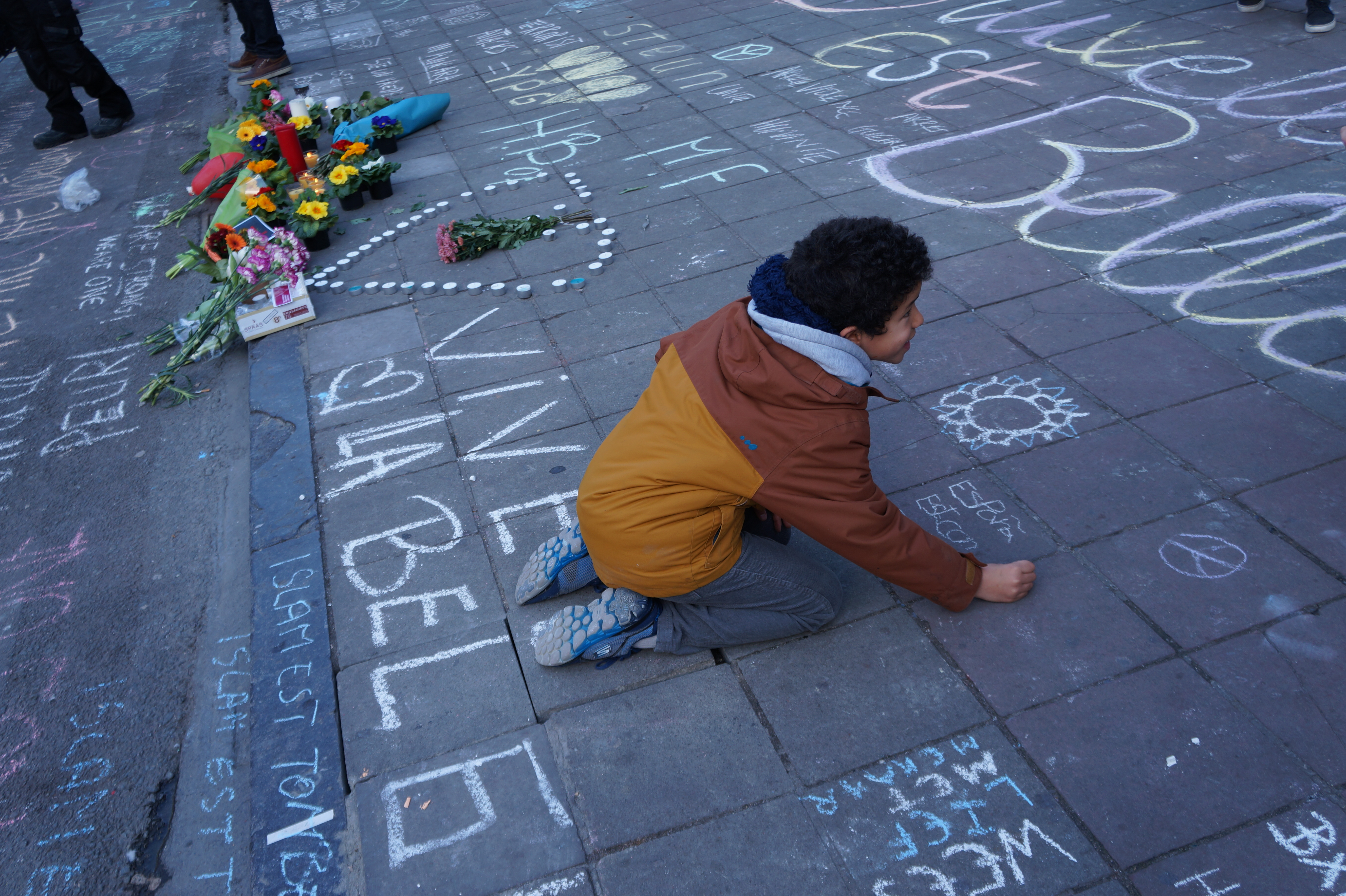 Bruxelles – I cittadini di Bruxelles si sono riuniti in piazza della Bourse, in pieno centro, per manifestare contro il terrorismo e la paura. Una manifestazione spontanea con fiori e messaggi lasciati dai passanti sul marciapiede. “Bruxelles è bella”, “Siamo forti, siamo uno” e “Condividi il tuo amore”, hanno scritto i cittadini con gessetti colorati.