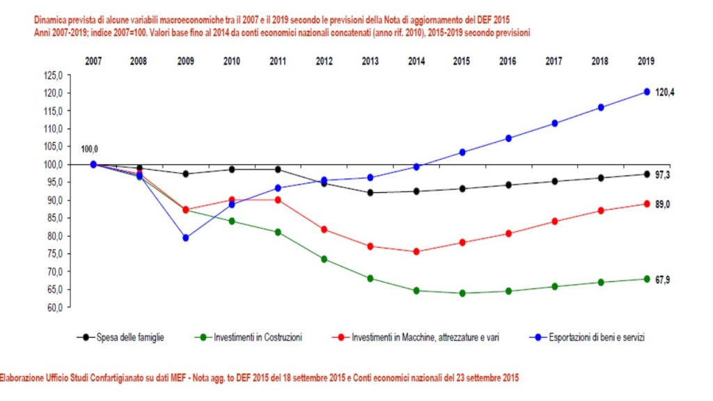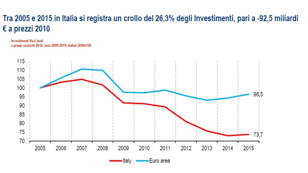Gli investimenti. Nel periodo 2005-2015 calano del 26,3% contro il 3,5% dell’area euro (quasi 100 miliardi di euro in meno (in euro del 2010)). Il tasso d’investimento è ai minimi storici dal 2007.