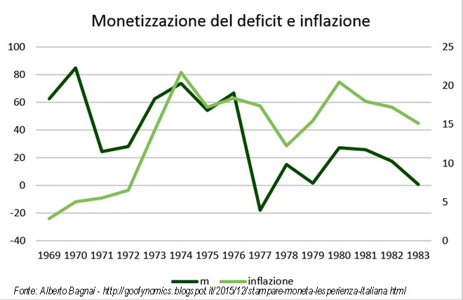 Gli “elicotteristi” infrangono anche un altro tabù (inventato da loro): quello del finanziamento della spesa con l’emissione di moneta. Fino agli anni ‘70 questa è stata una normale opzione di politica economica, ampiamente utilizzata in Italia come ha mostrato un saggio di Luigi Spaventa citato in un articolo di Alberto Bagnai: «Dal 1961 al divorzio (Tesoro-Bankitalia) il finanziamento monetario ha contato in media per il 37% della copertura del deficit». Già sentiamo la scontata obiezione: e infatti – replicheranno in molti – negli anni ‘70 è esplosa l’inflazione. Vero, ma era provocata da quello? Un grafico – sempre nell’articolo di Bagnai – risponde a questa domanda. Ecco il grafico:
