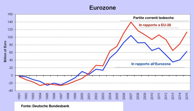 Meno soldi in tasca, meno consumi, meno import. In pratica, i paesi PIIGS hanno riequilibrato i propri conti con l’estero scaricandone i costi sui cittadini, senza scalfire i rapporti di forza commerciali in ambito europeo. Un dato su tutti: il surplus delle partite correnti della Germania ha raggiunto nel 2015 l’8,5% del prodotto lordo, 257 miliardi di euro. Numeri che gridano allo scandalo, visti i limiti imposti dalle regole europee ai paesi membri, sia per i surplus che per i deficit eccessivi.