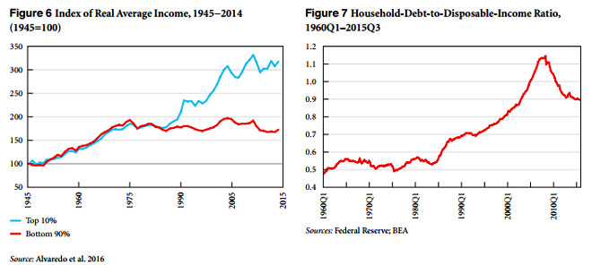 Il primo mostra gli indici dei redditi delle famiglie in termini reali dal 1945 al 2014 per il 10% più ricco e il restante 90%. Come si vede, fino agli anni ‘80 i due indici praticamente si sovrappongono, ma da quel periodo in poi i più ricchi diventano più ricchi, mentre gli altri nove decimi vedono i loro redditi fermarsi, e oggi sono al livello dei primi anni ‘70: per loro, cioè per la stragrande maggioranza della popolazione, quasi mezzo secolo perduto. E come mai hanno aspettato mezzo secolo prima di arrabbiarsi? Lo dice l’altro grafico: hanno fatto sempre più debiti, favoriti da politiche dei governi che facilitavano questo comportamento. Poi, però, con la crisi del 2008 è arrivata la resa dei conti: molte banche sono saltate, il credito facile è finito. E quel 90% si è trovato non solo con i redditi di cinquant’anni prima, ma anche a dover restituire i prestiti, come si vede dalla curva che scende vertiginosamente. Ecco, che si siano arrabbiati non sembra poi tanto strano.