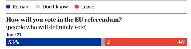 L’ultimo sondaggio di Orb per il quotidiano Daily Telegraph mostra il netto vantaggio del supporters europei con il 53%, mentre i brexiteers si fermano al 46%. Il risultato evidenzia una chiara inversione di tendenza degli elettori britannici, in particolare dopo la morte della deputata laburista Jo Cox, quando il Leave dominava con il 53%. Nonostante l’inversione dei fronti, lo stesso sondaggio, ha anche rilevato che il numero dei probabili votanti è sceso dal 69% al 64%.