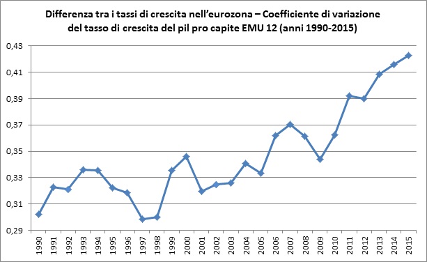 Per verificare quanto appena affermato, misuriamo la disomogeneità nelle performance macroeconomiche all’interno della zona euro mediante il coefficiente di variazione del tasso di crescita del PIL pro capite. Si osserva che i paesi dell’euro sono sempre più distanti fra loro. Dal 1990 a oggi, infatti, il coefficiente passa da 0.30 a 0.42 con una marcata accelerazione dopo lo scoppio della crisi e l’intensificarsi delle politiche di austerità.