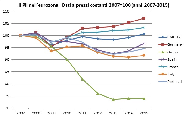 Ancora, possiamo effettuare delle comparazioni sull’andamento del PIL, ponendo pari a cento il valore registrato da alcuni paesi nel 2007, anno precedente lo scoppio della crisi. Si vede bene in quale macroscopica misura le aree periferiche si siano allontanate dai valori medi dell’eurozona e naturalmente in particolare dalla Germania (ma anche dalla Francia).