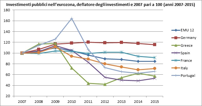 Queste analisi, confermano la tesi secondo cui i processi di centralizzazione dei capitali e di crescita della divergenza territoriale, favoriti dalla moneta unica, risultano aggravati dalle politiche di austerità e finiscono per pesare maggiormente proprio sulle aree periferiche d’Europa. Per controllare anche quest’ultima affermazione è sufficiente esaminare la dinamica degli investimenti pubblici, sempre ponendo il dato registrato da ciascun paese nel 2007 pari a cento.