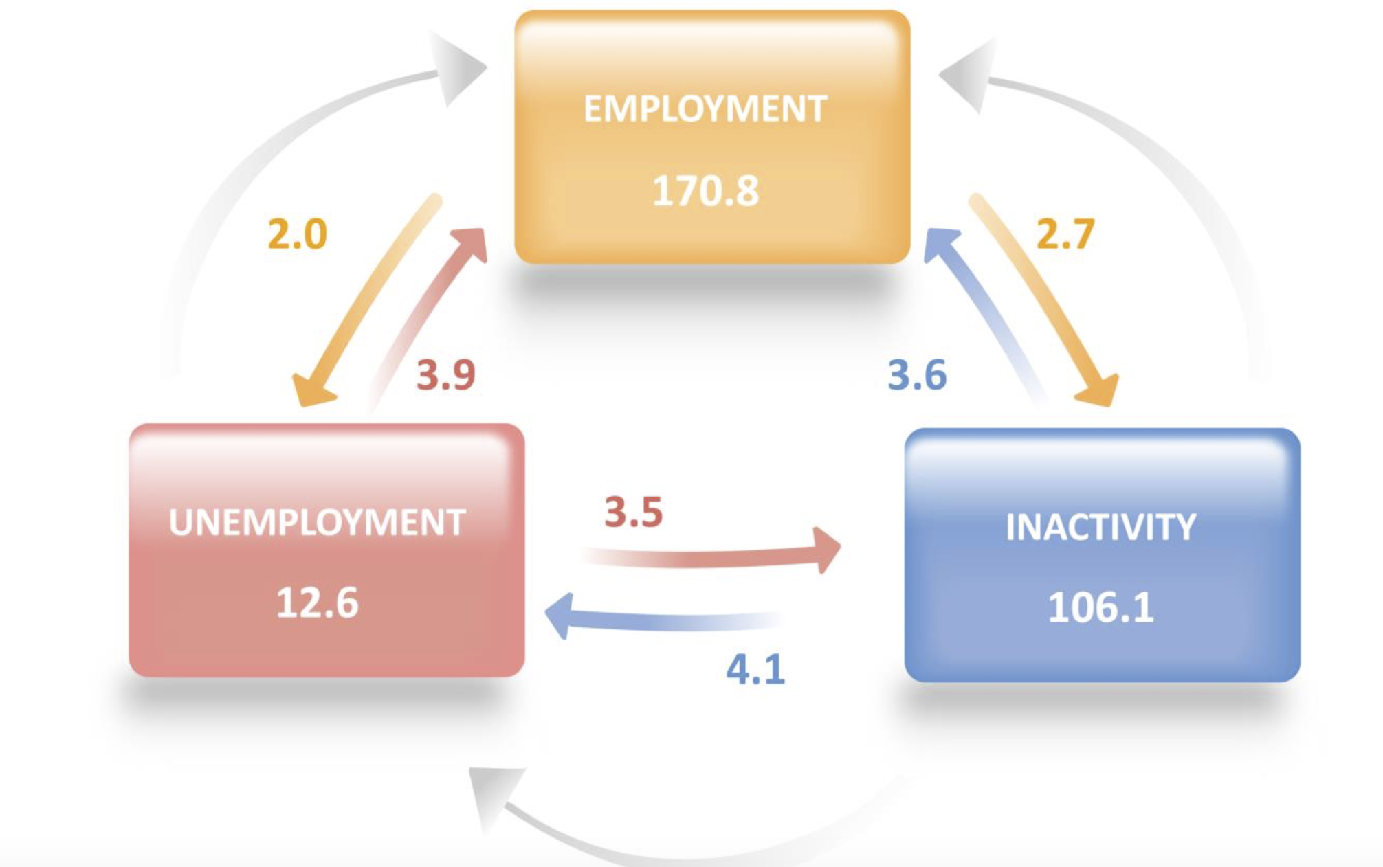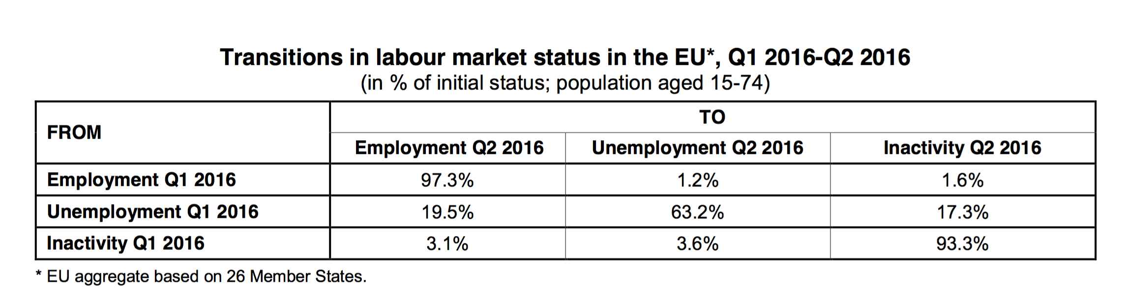 A livello europeo, un disoccupato su 5 dal primo al secondo semestre del 2016 ha trovato lavoro. Tra tutti coloro che nell’Unione europea erano disoccupati nella prima metà del 2016, il 63.2% (12,6 milioni di persone) è rimasto disoccupato nella seconda metà dell’anno, mentre 19,5% di loro (3,9 milioni) hanno trovato lavoro. Una percentuale simile, 17,3% (3,5 milioni) è invece finita nel buco nero degli inattivi, cioè coloro che non rientrano né nella categoria degli occupati né in quella dei disoccupati. Sono considerati “inattivi economici” studenti, pensionati, casalinghe: persone che non solo hanno un lavoro, ma neppure lo cercano.