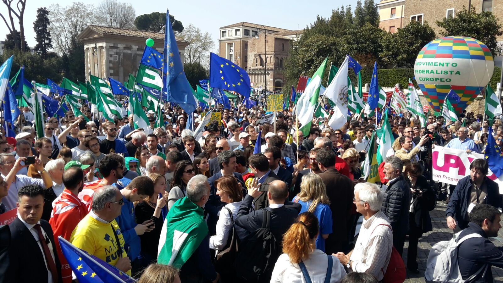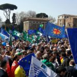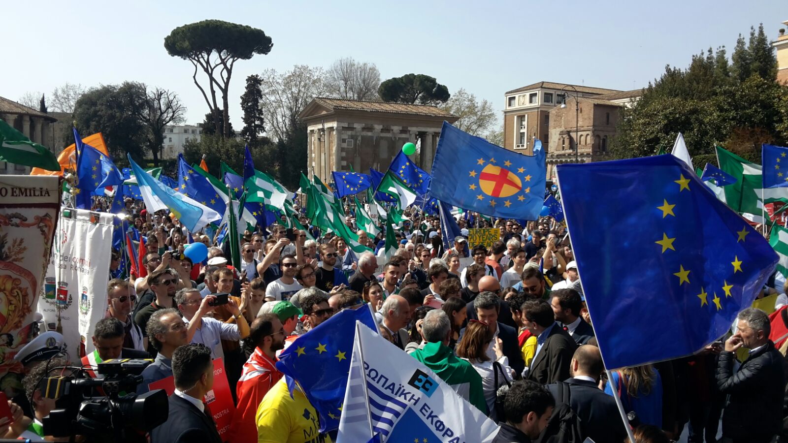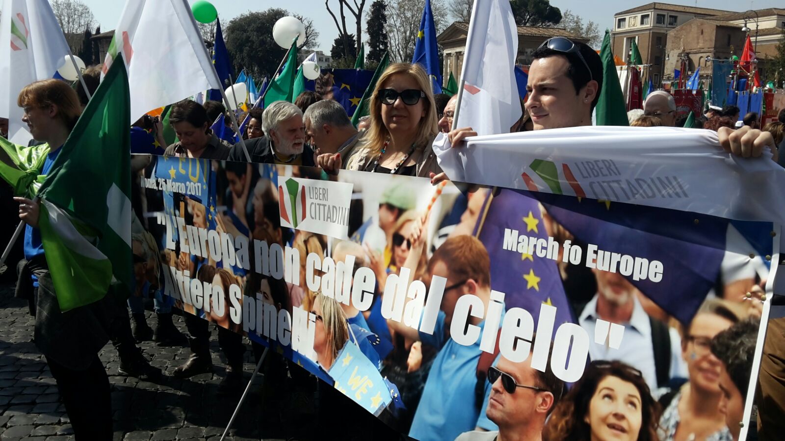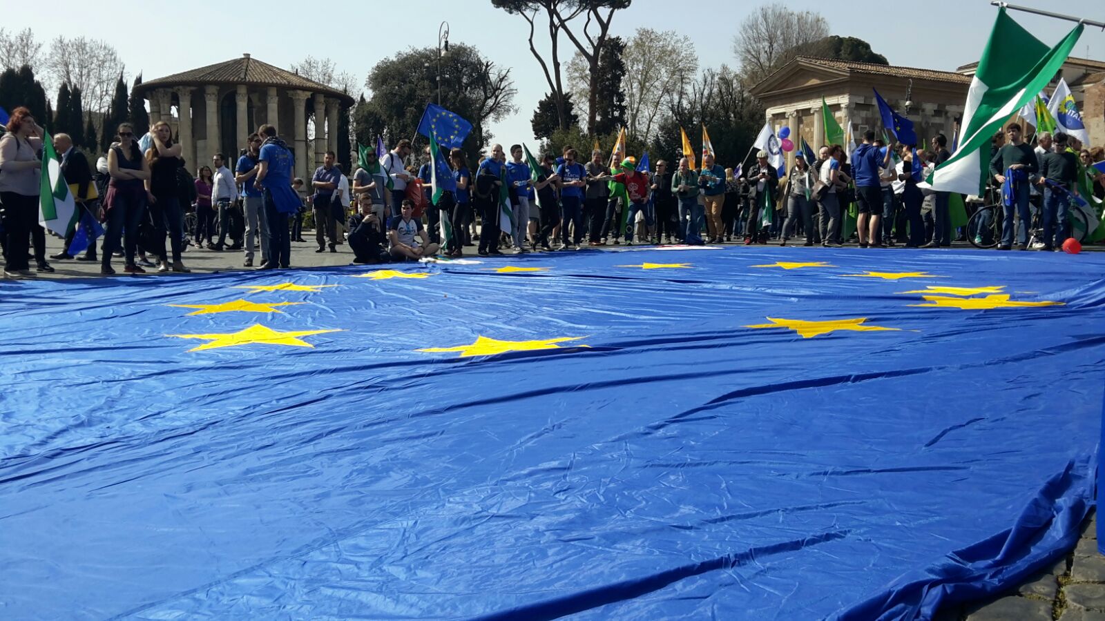 Roma – Colorata, festosa, multilingue, con partecipanti mediamente giovani e provenienti da tutta l’Ue: la Marcia per l’Europa 2017 è stata tutto ciò. Unica pecca: il corteo non era molto nutrito, tanto che, quando il gruppo dei federalisti europei si è congiunto a quello delle ong raccolte sotto lo slogan “La nostra Europa”, ai piedi del Colosseo si contavano non più di 2 o 3 mila persone. Non una folla oceanica, quindi, ma molto determinata nel chiedere un’Unione federale, più vicina ai cittadini, più coesa politicamente, più attenta al sociale e che sappia dare una risposta comune sulla questione migratoria e le altre sfide che si possono affrontare meglio a livello europeo perché la dimensione dello Stato nazionale non basta. Ecco la cronaca della giornata degli europeisti, arrivati a Roma per celebrare i sessant’anni della Comunità europea.