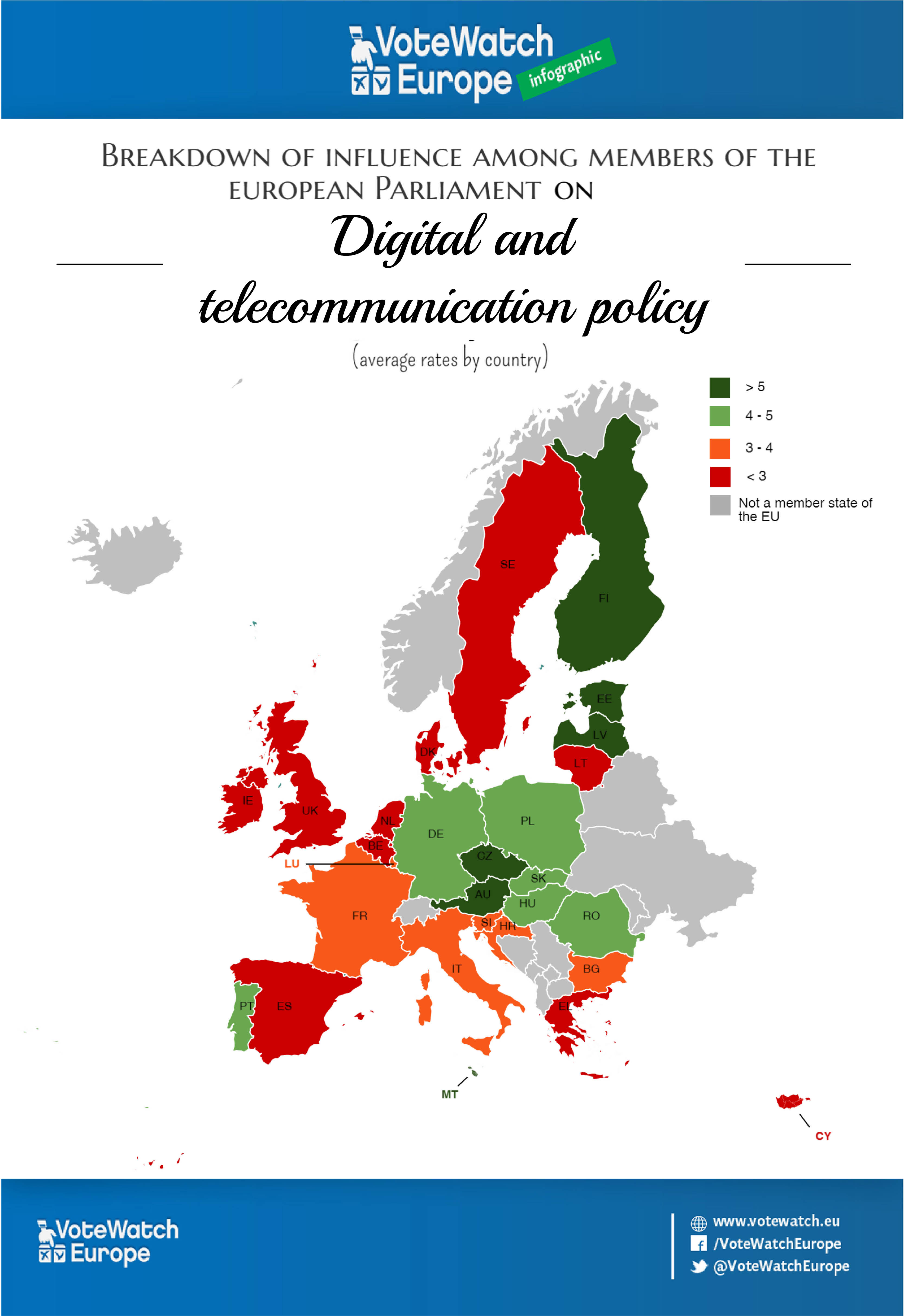 Secondo l’analisi di VoteWatch, gli europarlamentari greci e ciprioti sono i meno influenti sulle politiche digitali, ma attenzione a fare facili analogie fra il livello di digitalizzazione di un Paese e l’attività dei suoi rappresentanti riguardante tale settore. Danimarca, Svezia e Paesi Bassi hanno infatti in media una voce abbastanza debole a Strasburgo (nonostante alcuni singoli deputati si diano parecchio da fare), anche se le nuove tecnologie sono ampiamente più diffuse in quei territori rispetto ad altri del Sud Europa.