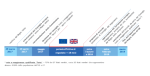 – Approccio in due fasi. Resta fermo il principio per cui prima di discutere di nuove relazioni bilaterali tra Ue e regno Unito bisogna avere progressi sufficienti nei punti prioritari per i Ventisette, vale a dire diritti dei cittadini, rispetto degli obblighi finanziari, e gestione delle frontiere tra repubblica d’Irlanda e Irlanda del Nord. “Spero si possa entrare il prima possibile nella seconda fase dei negoziati”, l’auspicio di Barnier, che indica in “ottobre-novembre” il periodo in cui vorrebbe discutere le future relazioni. Anche perché il calendario è indicato in modo chiaro. Per Bruxelles alla mezzanotte del 30 marzo 2019 il Regno Unito sarà fuori dall’Ue, e si precisa che in virtù del diverso fuso orario Londra sarà fuori alle 23 del 29 marzo 2019, ora di Greenwich.