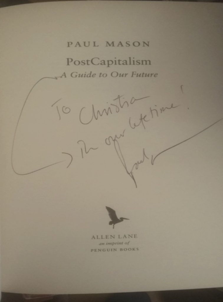 Ho incontrato Paul Mason al Glasgow Economic Forum del 2016. Mi ha onorato di una dedica sulla mia copia del suo libro.