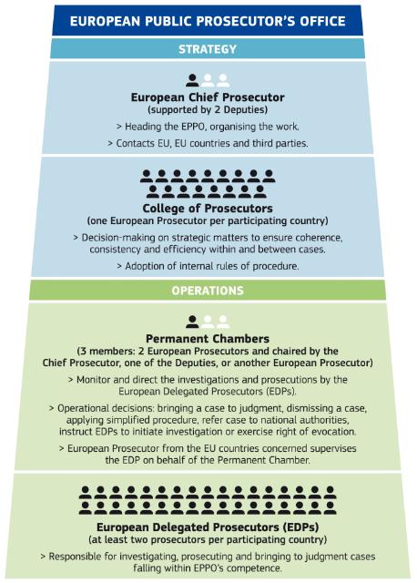La procura europea agirà come organismo unico in tutti gli Stati membri partecipanti e tutelerà l’interesse dell’Ue, senza chiedere o ricevere istruzioni dalle istituzioni comunitarie o dalle autorità nazionali. Oltre alla sede centrale in Lussemburgo, disporrà di sedi decentrate negli Stati membri, dove opereranno procuratori delegati europei che, in parallelo, continueranno a svolgere le funzioni di procuratori nazionali (“doppio incarico”). Sarà quindi una struttura collegiale composta da due livelli: il livello centrale sarà costituito da un procuratore principale europeo, che avrà la responsabilità generale dell’ufficio in cui lavorerà con due vice; il livello decentrato conterà su procuratori delegati europei situati negli Stati membri, con l’incarico dei compiti quotidiani di indagini e azioni penali, in linea con il regolamento e la legislazione di tale Stato membro. La sede centrale opererà una supervisione delle indagini e delle azioni penali effettuate a livello nazionale al fine di garantire un effettivo coordinamento e un approccio uniforme in tutta l’Ue. Quando la Procura europea avvierà un’indagine, le autorità nazionali non potranno più esercitare le proprie competenze in relazione alla stessa attività criminale.