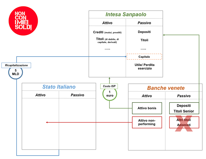 - Gli accordi di Basilea prevedono che il rapporto fra il capitale proprio della banca e i suoi impieghi ponderati per il rischio (un titolo di Stato europeo viene comunemente ritenuto meno rischioso di un mutuo) non debba mai scendere sotto determinate soglie: questo espediente serv(irebb)e a garantire che in caso di deterioramento, la banca abbia comunque strumenti necessari a soddisfare le richieste di depositanti e creditori. In questo caso, avendo assorbito gli attivi (good bank) delle due banche venete, Intesa avrebbe dovuto aumentare il proprio capitale sociale per mantenere invariata la frazione (se aumento il denominatore-gli impieghi, devo aumentare proporzionalmente i numeratore, il capitale). La cifra in oggetto, un importo complessivo di circa 5 miliardi di euro, è stata pagata dallo Stato italiano.