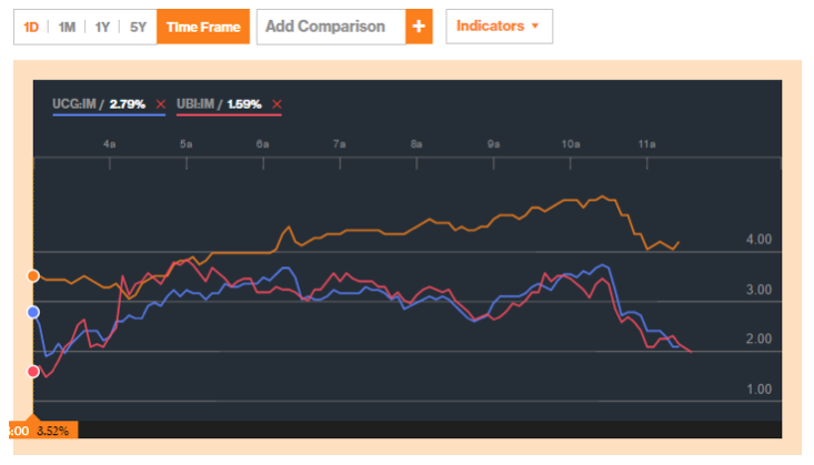 Il guadagno di Borsa di Intesa (in arancione) nella giornata successiva all’approvazione del decreto (lunedì 26). In blu e in rosso l’andamento di UBI e Unicredit nella stessa giornata.