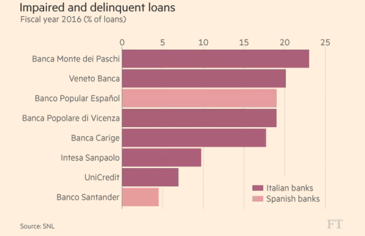 La percentuale di prestiti non-performing negli attivi delle banche italiane e spagnole, e la massa complessiva di prestiti non-performing nel sistema bancario italiano.
