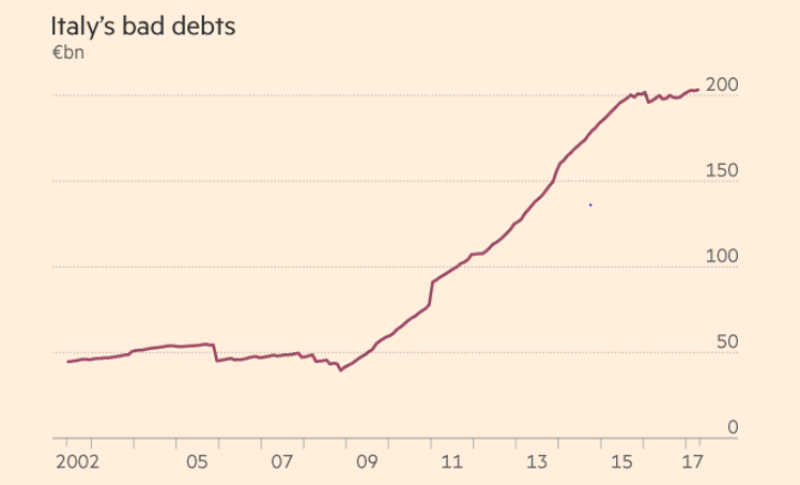 Superata questa premessa, gli ultimi due grafici che qui commentiamo mostrano – congiuntamente – il valore crescente dei crediti deteriorati nel sistema bancario italiano. Un valore che segue l’andamento macroeconomico dell’economia del paese, e in particolare della piccola e media industria che costituisce il tessuto produttivo su cui le banche hanno costruito la propria funzione sociale, oltre che le proprie fortune.