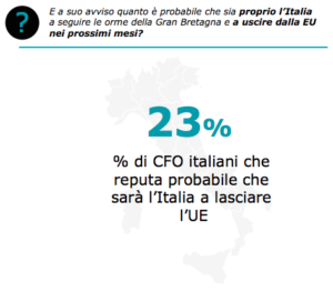 Diffuso, invece, è il timore di altre “exit” con il 45% dei direttori italiani che ritiene probabile che nei prossimi 5 anni altri Stati membri seguiranno l’esempio del Regno Unito e il 23% che pensa che a lasciare l’Ue sarà proprio l’Italia.
