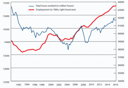 Sì, è vero che il numero di tedeschi con un’occupazione è cresciuto di circa il 15 per cento dai record negativi toccati a metà degli anni ’90. Ma il numero totale di ore lavorate rispetto allo stesso periodo è cresciuto di meno del 2% ed è ancora notevolmente inferiore rispetto al numero di ore lavorate agli inizi degli anni ’90: