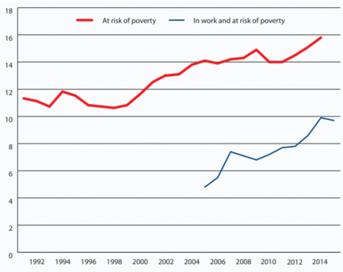 Come osserva Odendahl, questo non sarebbe necessariamente un problema se il boom dell’occupazione fosse coinciso con un diffuso desiderio di trascorrere meno tempo sul posto di lavoro. Ma questo è improbabile, poiché la disconnessione tra posti di lavoro e ore lavorate è andata di pari passo con un forte aumento della quota di tedeschi a rischio di povertà: