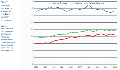 Odendahl sottolinea inoltre che più di un quinto dei lavoratori della Germania occidentale hanno salari bassi (cioè hanno un salario inferiore ai due terzi della mediana, o di circa 10,50 euro all’ora nel 2014). Mentre erano solo il 15% a metà degli anni ’90: