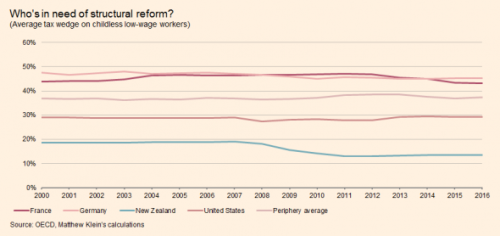 La tassazione tedesca sui lavoratori a basso reddito era tra le più alte al mondo quando è iniziata la raccolta dei relativi dati, nel 2000, e tale è rimasta da allora. Non c’è da meravigliarsi che i consumatori tedeschi siano messi così male! E questo non è solo un male per i lavoratori tedeschi, ma per tutto il mondo. Se solo ci fossero politici tedeschi intenzionati ad affrontare questo problema…