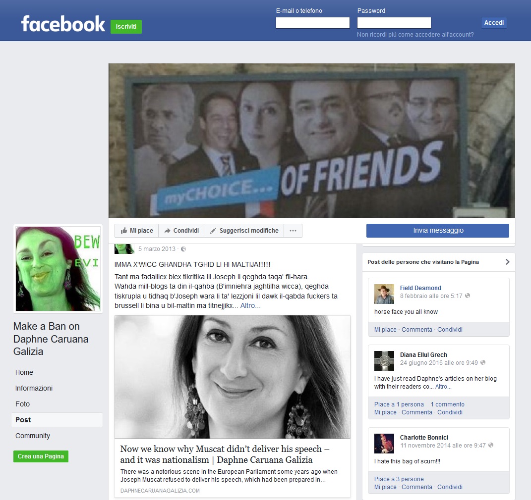 La pagina Facebook, che al momento della pubblicazione di questo articolo risulta ancora attiva, con i suoi 451 mi piace, attacca con insulti e minacce la giornalista, che nell’immagine di sfondo è rappresentata come un mostro verde. La giornalista è accusata di tramare contro Malta, e gli insulti, tutti in maltese, sono veri e propri auguri di morte. Gli utenti l’additano come “traditrice della patria” per “aver infangato il buon nome di Joseph Muscat e del Paese tutto”.