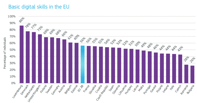 Bruxelles – L’Italia rischia di perdere la sfida del futuro. Si tratta della partita tecnologica, della spinta all’innovazione, della rivoluzione informatica. “In futuro nove posti di lavoro su dieci richiederanno competenze digitali”, rileva la Commissione europea e non a caso. In Europa attualmente solo il 56% dei cittadini di età compresa tra i 16 e i 74 anni ha conoscenze informatiche di base. Vuol dire che quattro europei su dieci non stanno al passo coi tempi, con gli italiani che fanno più fatica ancora. L’Italia è quartultima su 28 per tasso di alfabetizzazione informatica della popolazione. Solo il 44% della popolazione può cercare di rispondere alle esigenze di un settore che, da qui al 2025, potrebbe arrivare a creare fino a 1,3 milioni di nuovi posti di lavoro. Volendo leggerla in un altro modo, sei italiani su dieci sono già fuori mercato. Solo le performance di Bulgaria (26%), Romania (28%) e Cipro (43%) sono peggiori di quelle tricolori.