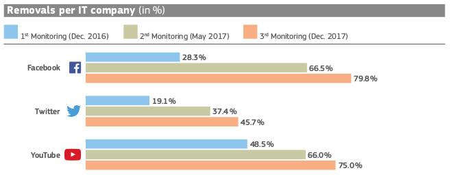 Riconoscere la potenzialità forza istigatrice dei messaggi pubblicati su internet “non è così facile” come potrebbe sembrare, spiega Jourova nel presentare i risultati dell’ultimo rapporto sul monitoraggio dei discorsi on-line. Si tratta della valutazione del codice di condotta sottoscritto tra Unione europea e principali operatori interneti (Facebook, Twitter, Youtube e Microsoft, cui hanno annunciato di aggiungersi pure Instagram e Google Plus). I risultati sono positivi, secondo la Commissione, perchè registrano un aumento nella rimozione di contenuti a sfondo razzista, xenofobo, anti-islamico. In media, le società informatiche hanno rimosso il 70% di tutti i messaggi illegali di incitamento all’odio loro notificati da Ong, utenti ed enti pubblici (ben 2.982 i messaggi segnalati). Questa percentuale raggiungeva il 28% nei primi controlli del 2016 il 59% a maggio 2017. Non solo. E’ migliorato il tempo di reazione alle segnalazioni. L’81% dei messaggi incriminati è stato verificato in un arco di 24 ore. A maggio scorso il tasso di controlli giornalieri era al 51%.