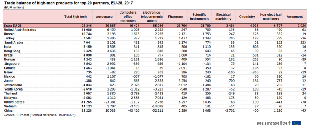 Stati Uniti e Cina sono rispettivamente il primo e il secondo mercato per le esportazioni europee di prodotti tecnologici. Nel 2017 l’Ue nel suo complesso ha venduto agli americani tecnologie per 84 miliardi di euro, e ai cinesi per 39 miliardi di euro. Terzo e quarto acquirente dell’Ue la Svizzera (21 miliardi) e gli Emirati Arabi (13 miliardi). Aerospazio, farmaci e telecomunicazioni i settori oggetto di domanda extra-comunitaria.
