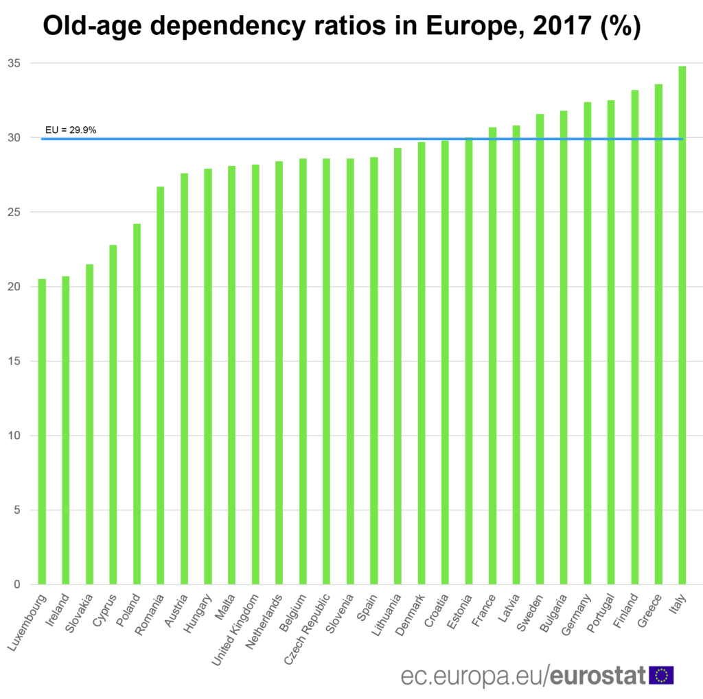 Bruxelles – L’Italia è un paese vecchio. Nessuno in Europa ha un indice di dipendenza degli anziani come quello tricolore. La dipendenza degli anziani misura il numero di abitanti non attivi (65 anni o più) per 100 persone attive (dai 15 ai 64 anni di età), e allora, dati Eurostat alla mano, vuol dire che in Italia c’è un rapporto di 1:3 (35 persone non attive ogni 100 attive) come solo nella Penisola.