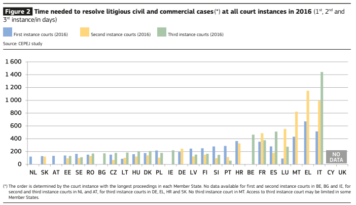 Quello della Commissione europea è un esercizio che si ripete ogni anno. La classifica della qualità dei sistemi di giustizia degli Stati membri è un appuntamento costante con cui “incoraggiamo e diamo esempi di buone riforme della giustizia”, ripete la commissaria. Di indicazioni, per l’Italia, ne arrivano diverse, e si aggiungono alle raccomandazioni specifiche per Paese già pubblicate la scorsa settimana in cui si chiede di ridurre i tempi dei processi. Un altro esempio di questo problema è rappresentato dai casi relativi al riciclaggio di denaro: per avere una decisione di prima istanza occorre attendere quasi due anni (poco più di 700 giorni). Solo la Lettonia ci mette di più.