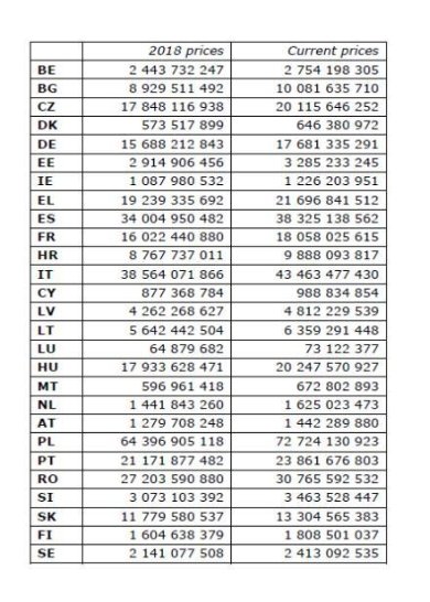 La tabella presentata dalla Commissione europea sui fondi attuali e quelli previsti.